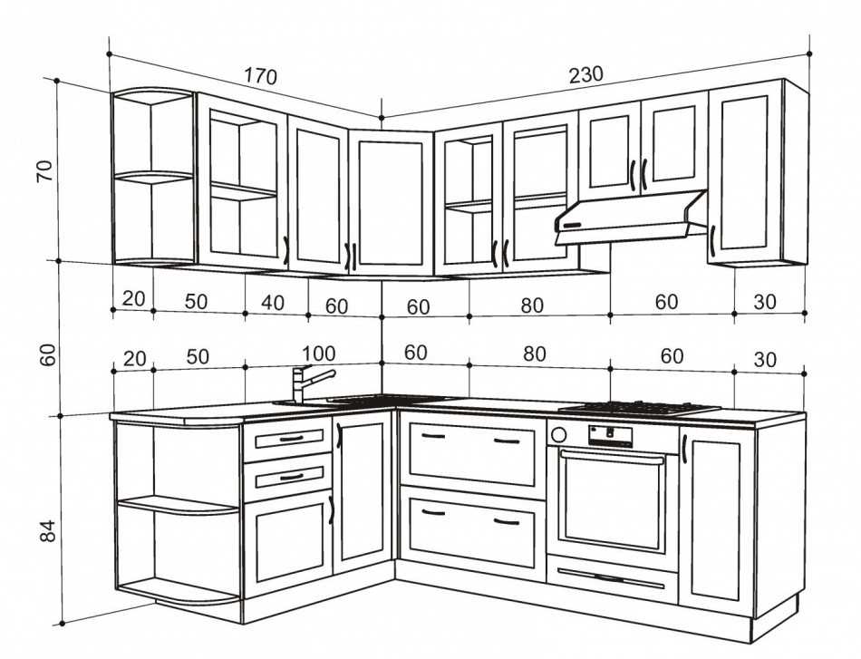 Разрабатывая проект кухни, необходимо изначально определиться с принципами ранжирования свободного пространства в помещении. Во-первых, нужно задать высоту рабочей поверхности. Для этого измеряют высоту от пола до согнутой руки и вычитают 78-100 мм. Во-вторых, навесные шкафы должны быть на 600-700 мм выше столешницы, а вытяжка на 750 мм выше газовой плиты и на 650 мм над электрической.