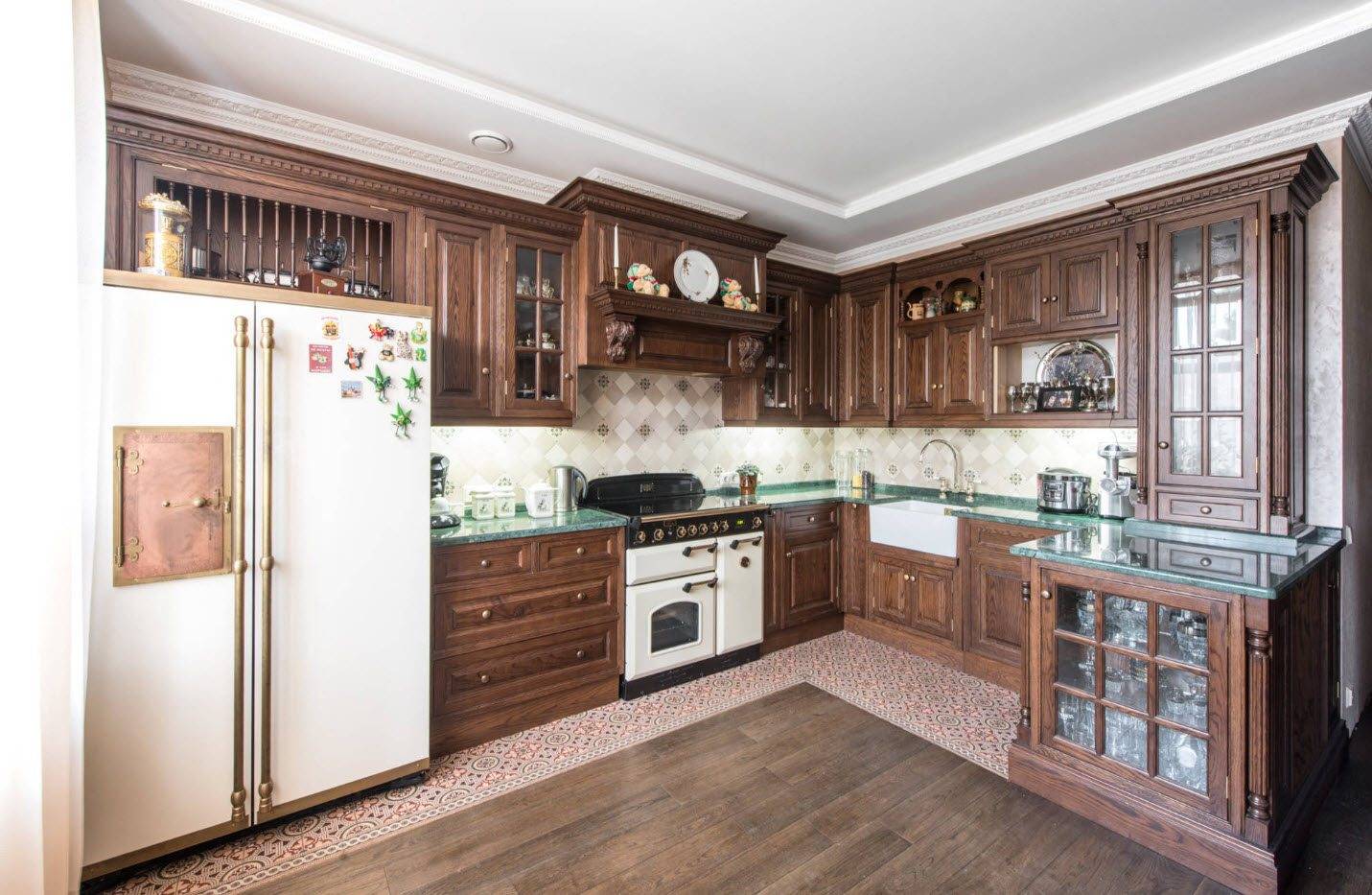 Традиционный вариант кухни формируется массивными шкафами для различных предметов, пачек соли, специй и других полезных расходных материалов. Его особенностью считается долговечность и непритязательные формы мебели.