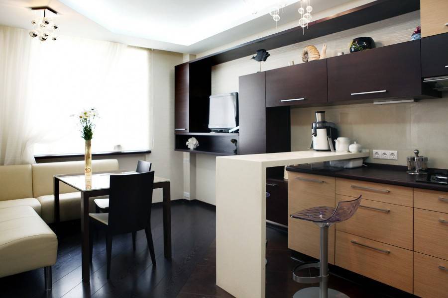 Первый метод подразумевает хорошее освещение в кухне-гостиной, поэтому для отделки потолка используется глянцевая или акриловая краска. Белый или бежевый ламинат с древесной текстурой укладывается на пол. Мебель с темными дверцами, бытовая техника, контрастные оттенки, позволяют разбавить дизайн.