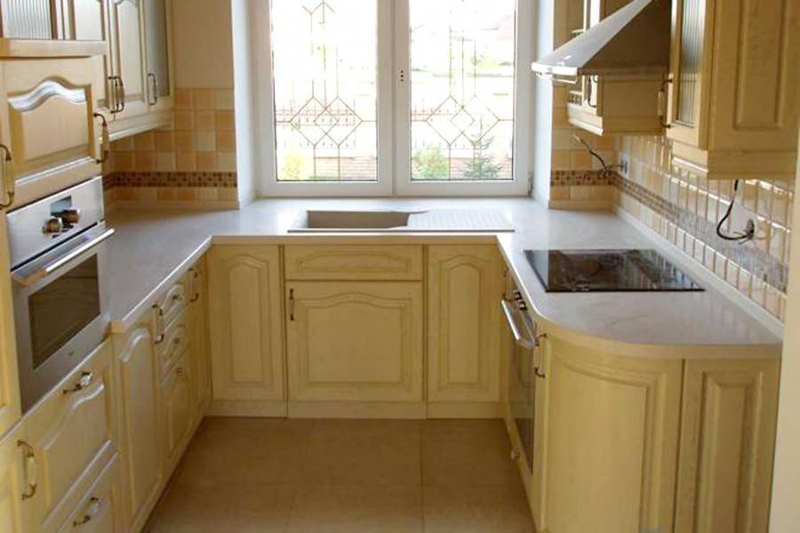 Обычно для маленьких кухонь используют г-образною планировку