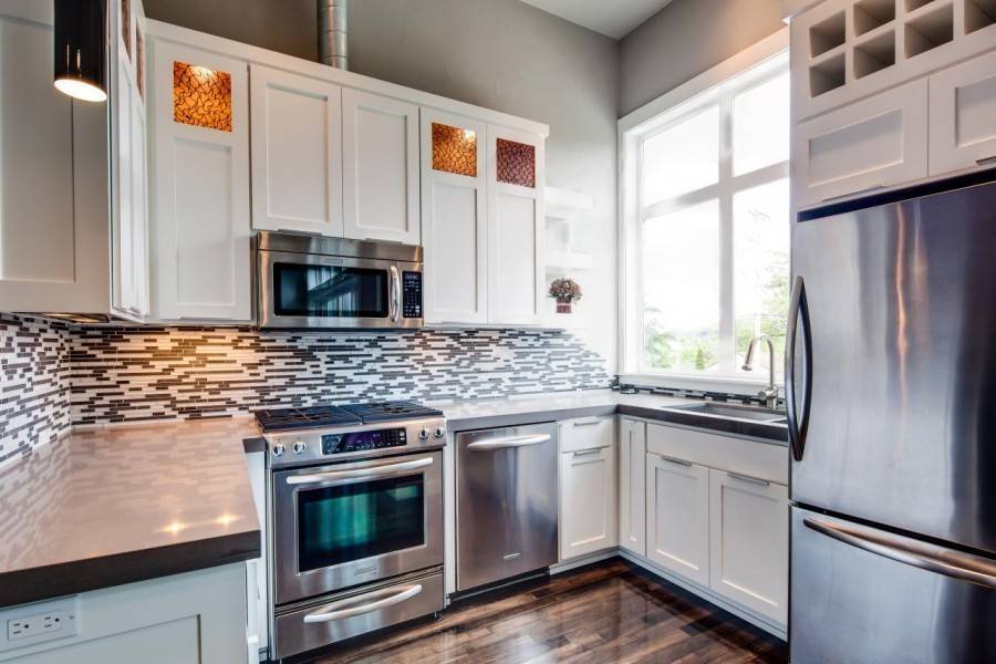 При планировании дизайна примите во внимание, что микроволновую печь можно поставить на полку или убрать в навесной шкаф. Менее популярный вариант – поставить ее на столешницу нижнего шкафчика, поскольку в этом случае она займет большую часть рабочей поверхности и будет вам мешать
