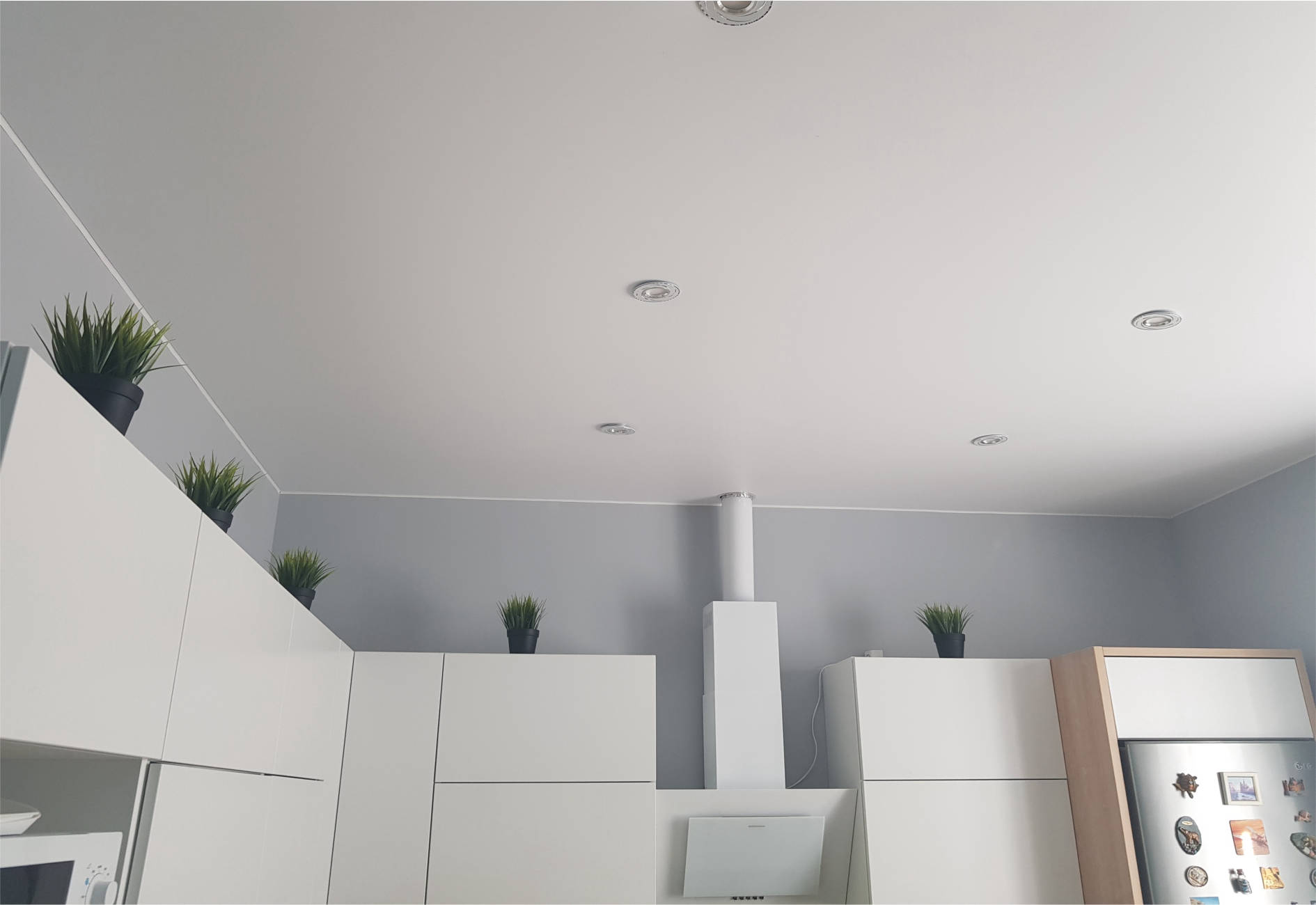 Кухонные шкафчики, закрепленные на стенах, должны достигать потолков. В некоторых случаях мастера «опускают» потолок гипсокартоном.