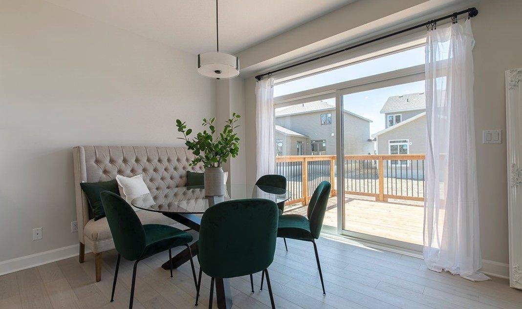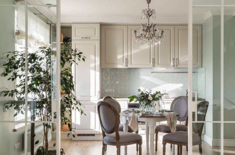 Обеденную и рабочую зону кухни обустройте в защищенном от сквозняков месте. Холодные нисходящие потоки воздуха через дверной проем балкона создадут дискомфорт сидящим за обеденным столом.