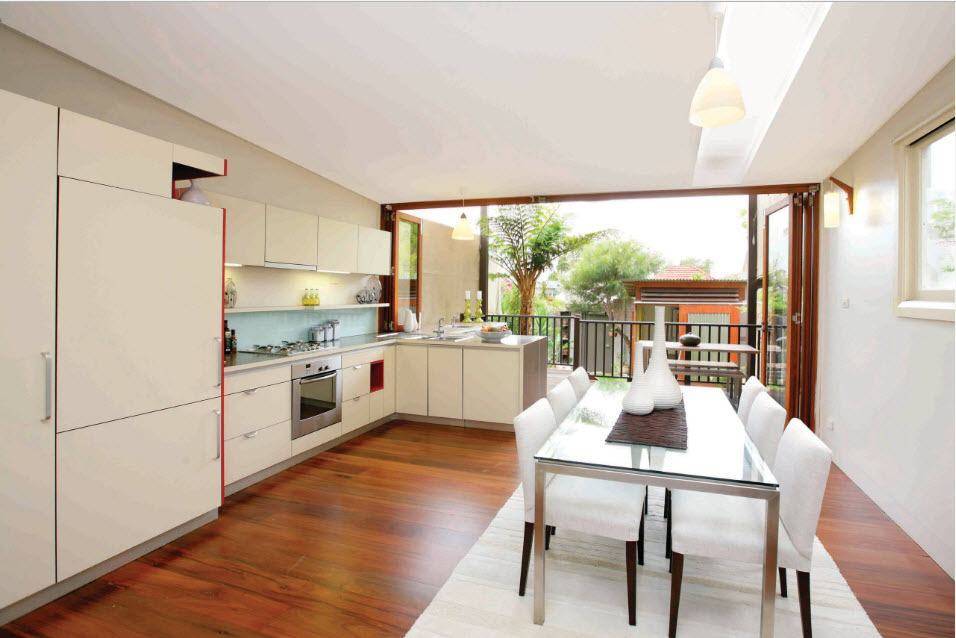 Расположение на лоджии столовой зоны. Этот вариант приходиться по душе большинству людей, так как благодаря такой идее рабочая зона кухни увеличивается и становится более просторной. Более того, обедать на территории лоджии гораздо интереснее, ведь можно любоваться видом из окна или смотреть на «капризы» погоды попивая при этом чашечку горячего чая. Также в качестве оригинальной идеи можно использовать панорамное остекление, что создаст уютную атмосферу и придаст кухне максимум естественного освещения в дневное время.