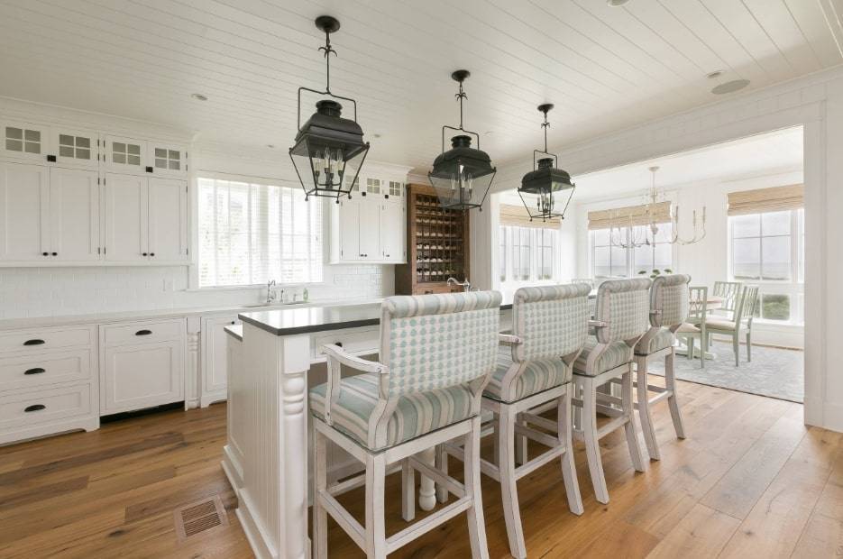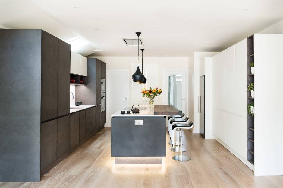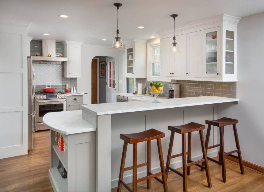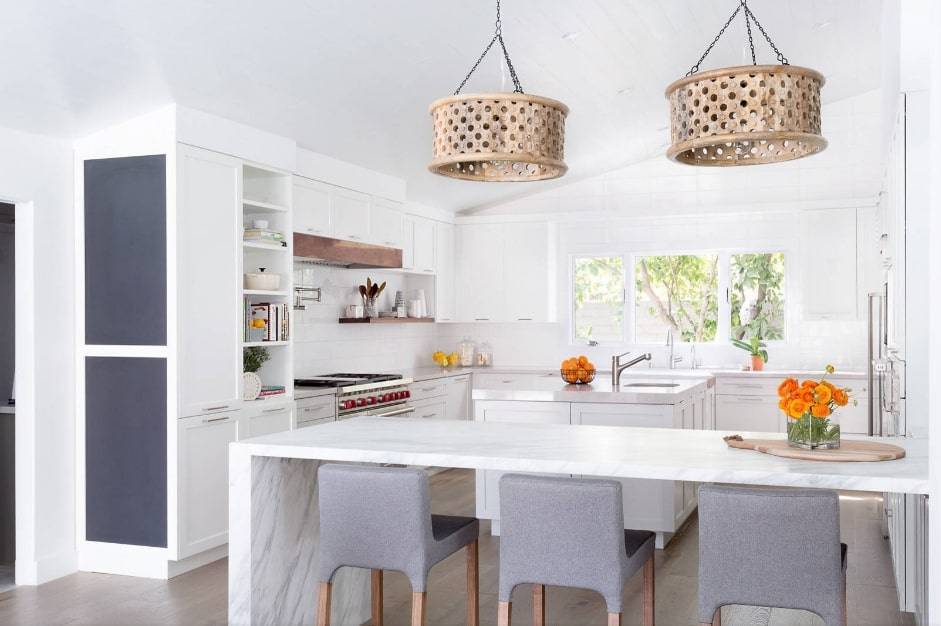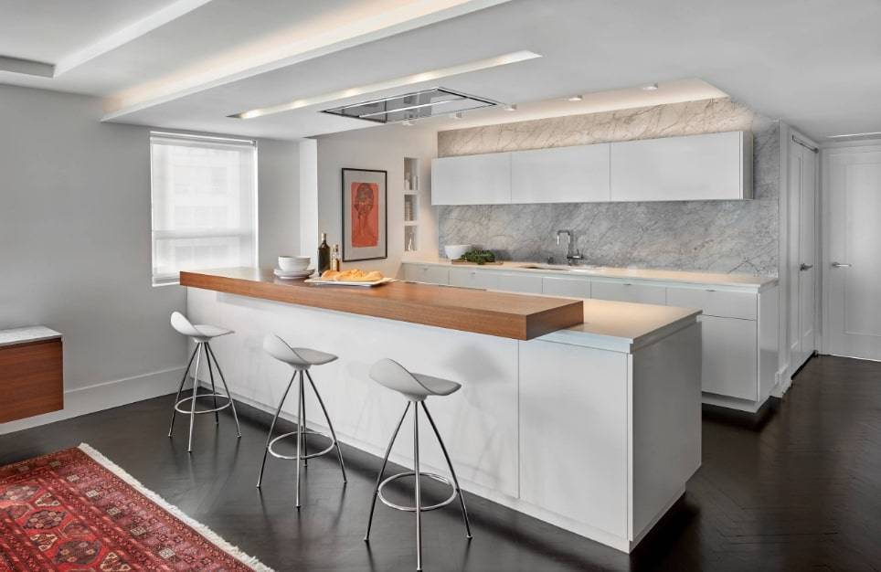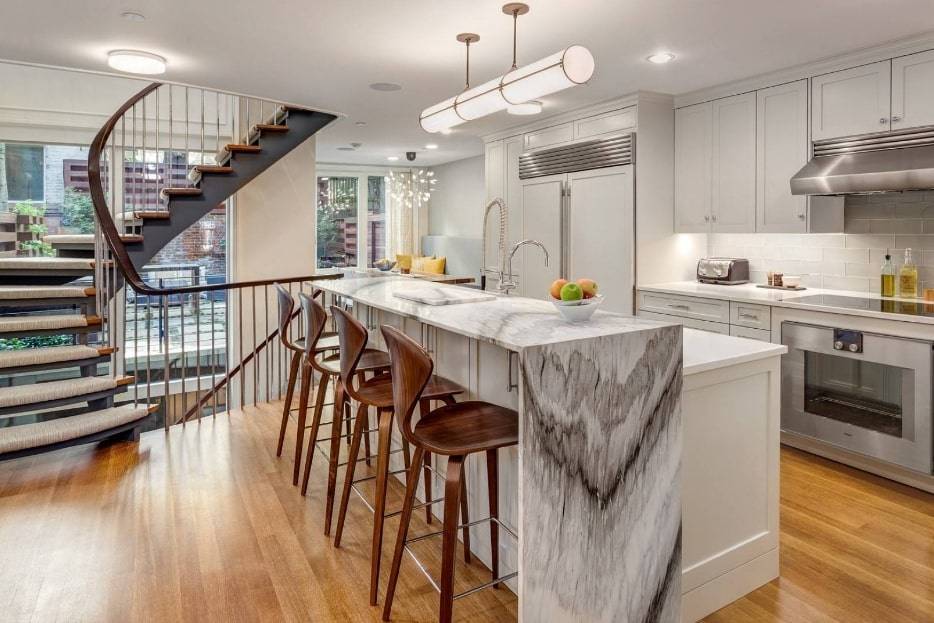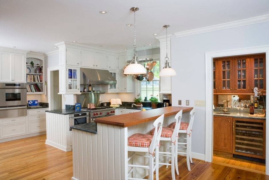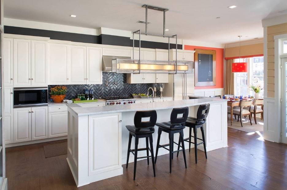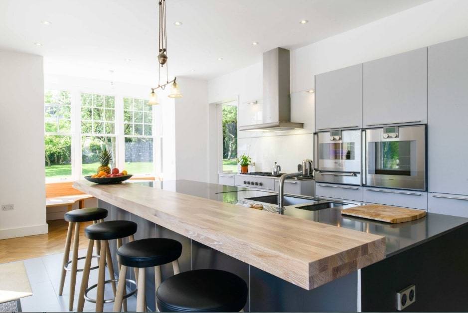Другой способ обустроить кухню с барной стойкой — это расширить остров или столешницу. Следует помнить, что бар должен быть немного выше, чтобы вы могли комфортно сидеть на высоких стульях. Опять же, конструкцию можно использовать в качестве дополнительного верха или места для обслуживания блюд. Вместе с островом барная стойка образует символическую границу между кухонной частью и гостиной. Если места достаточно, то стойка заполнит его хорошо, привлекая своей красотой и функциональностью.