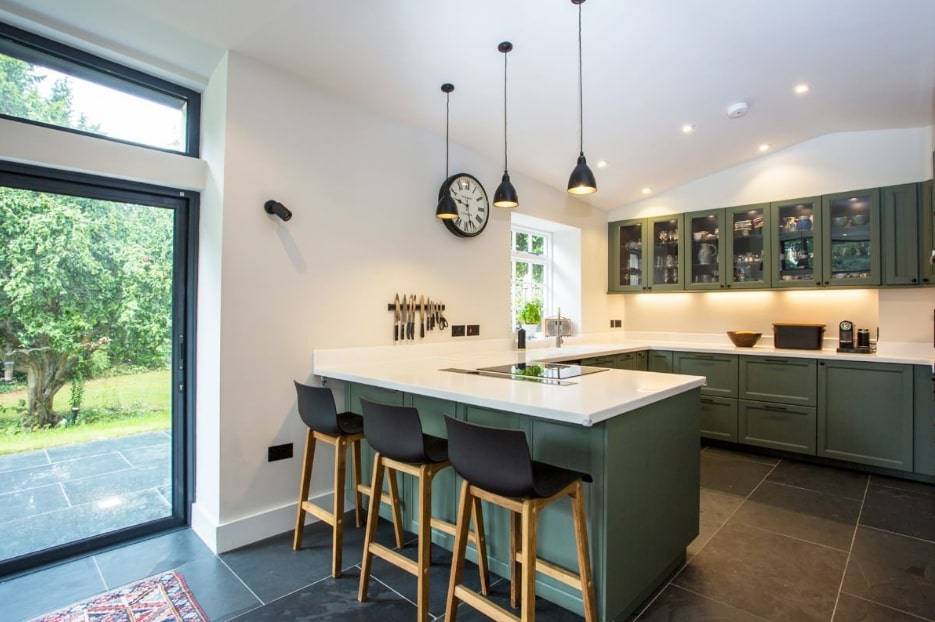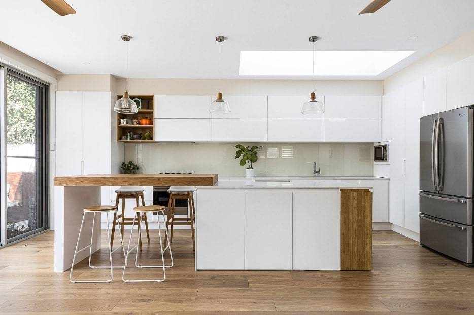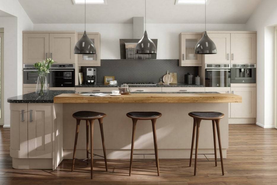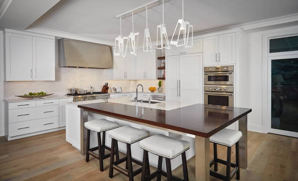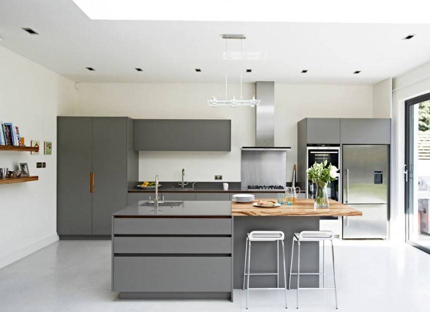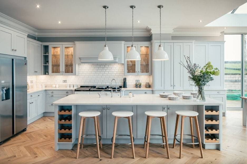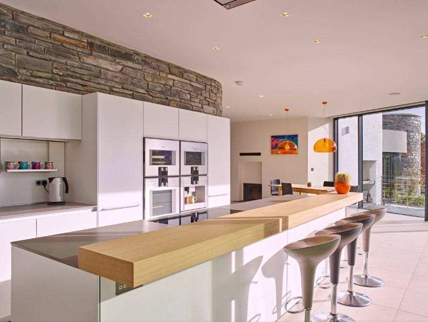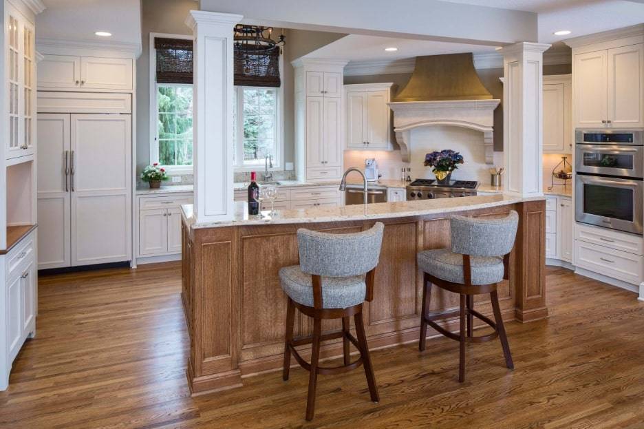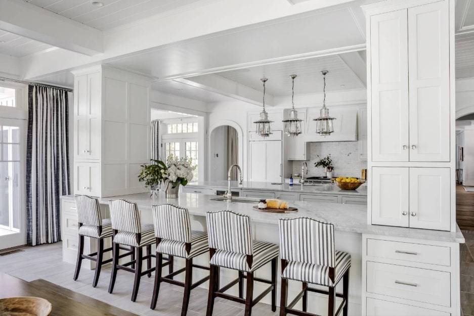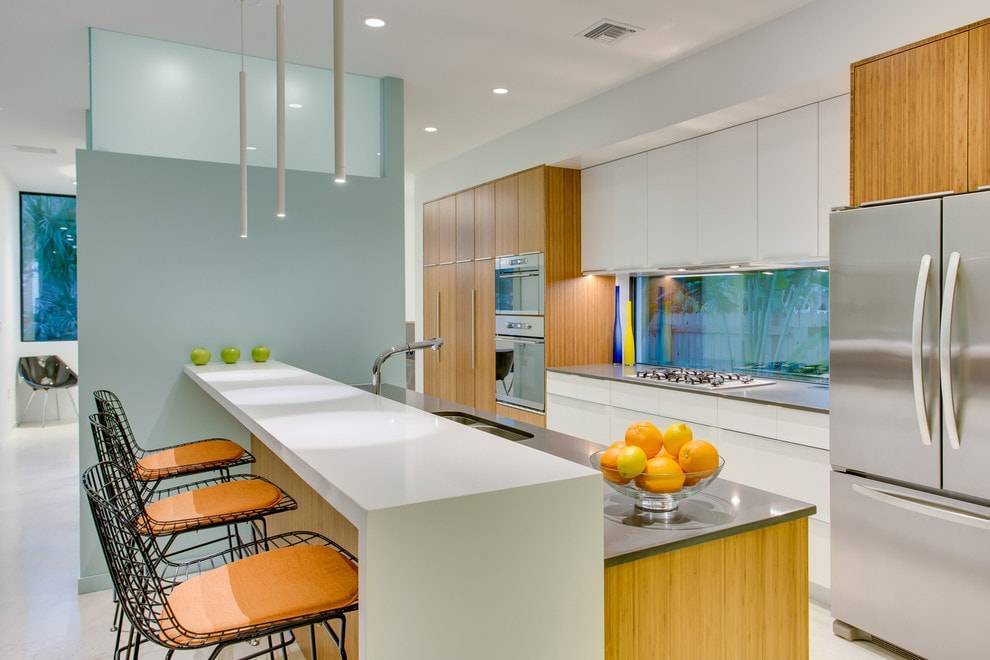 Другой способ обустроить кухню с барной стойкой — это расширить остров или столешницу. Следует помнить, что бар должен быть немного выше, чтобы вы могли комфортно сидеть на высоких стульях. Опять же, конструкцию можно использовать в качестве дополнительного верха или места для обслуживания блюд. Вместе с островом барная стойка образует символическую границу между кухонной частью и гостиной. Если места достаточно, то стойка заполнит его хорошо, привлекая своей красотой и функциональностью.