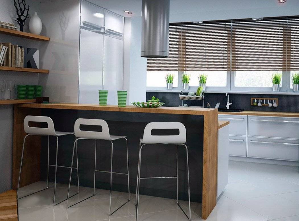 На первый взгляд в кухне скромных размеров, барная стойка будет неуместной. Однако это далеко не так, особенно для небольших семей. В таком случае, нею можно заменить обеденный стол или же использовать для посиделок за порцией напитка с друзьями.Даже в помещении небольшого размера поместится барная стойка и 2-3 стула. Этого вполне достаточно, чтобы разместить здесь несколько человек. Чтобы не перегружать пространство, лучше подобрать стулья из прозрачного пластика. В небольшом помещении на помощь придет многоуровневая барная стойка. Так называют конструкцию, где основная рабочая поверхность находится на высоте около 1 метра, а над ней на высоте 20-30 см размещаются дополнительные.