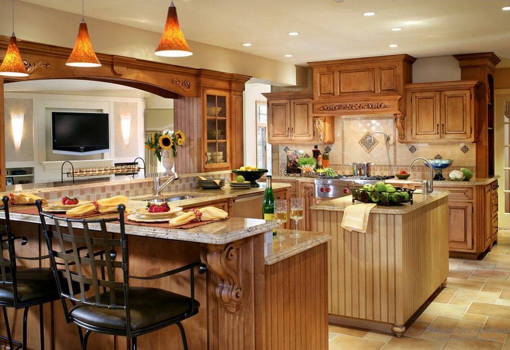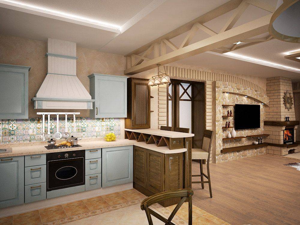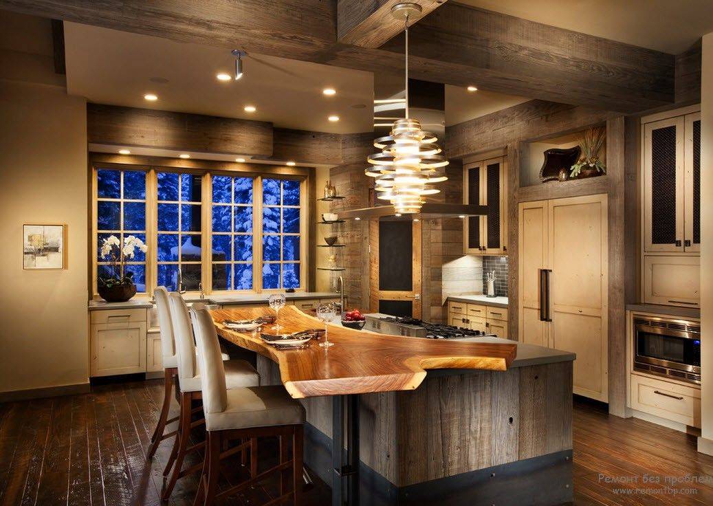 Данное направление в дизайне интерьере объединяет в себе уют и функциональность. На стыке кухни и гостиной можно разместить широкую барную стойку из натурального дерева. Таким образом, получится не только разделить пространство, но и создать дополнительное место для приготовления и принятия пищи.