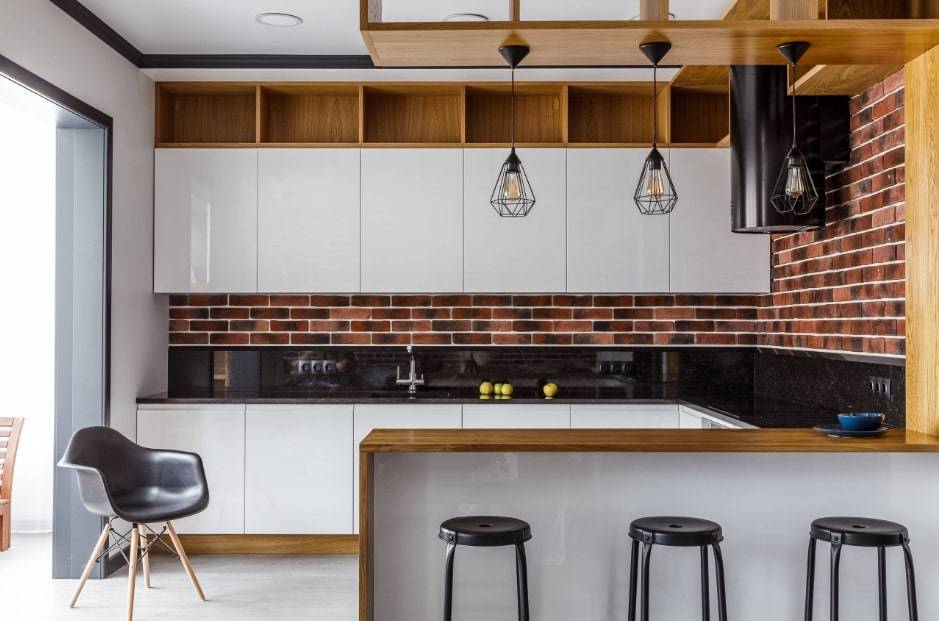 Сочетание современной мини-кухни с модными отделочными материалами, например, сырым кирпичом или бетоном, всегда выглядит фантастически. Интерьер изящный и престижный благодаря своей простой договоренности. Кухня с барной стойкой создает единство из-за расширения столешницы, однако, данная деталь интерьера может быть немного выше, чем остров, и таким образом вы с легкостью можете скрыть все, что происходит на кухне от людей, находящихся в гостиной. Это несомненное преимущество барной стоки! Стулья в таком случае лучше подобрать из натуральных материалов, которые придадут благородный вид всей стилизации.