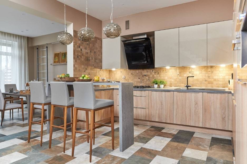 Эффектно подчеркнуть зонирование поможет контрастный пол. Черная керамическая плитка рабочей зоны будет очень заметна на фоне пола зала, выложенного светлым ламинатом, напоминающим выбеленное дерево.