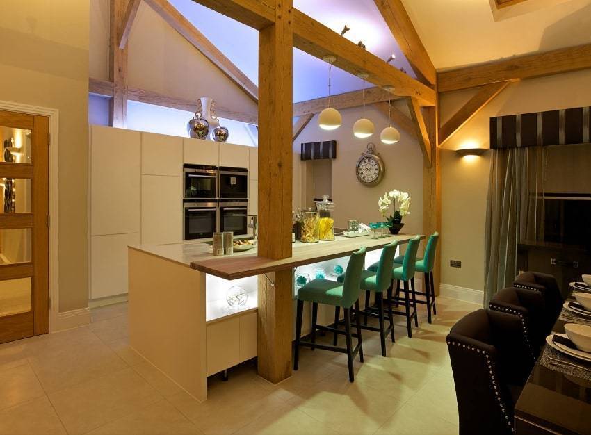 Кухня с барной стойкой часто ассоциируется только с современным стилем, который фокусируется на функциональности и открытости. Однако добавление этой конструкции чрезвычайно привлекательно для ретро-стиля. На барной стойке можно организовать уютный завтрак. Кухня с баром может либо соединяться с островом, либо просто быть отдельным элементом. Стильные, деревенские аксессуары, деревянные бревна и отделка из натурального материала создают уютный интерьер, который оптически кажется еще интереснее благодаря соединению с барной стойкой.