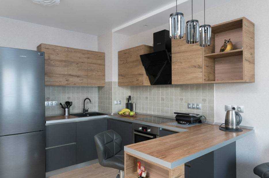 - столешницу рабочей области и барной стойки обустройте на одном уровне, выбрав в качестве материала массив натурального дерева;