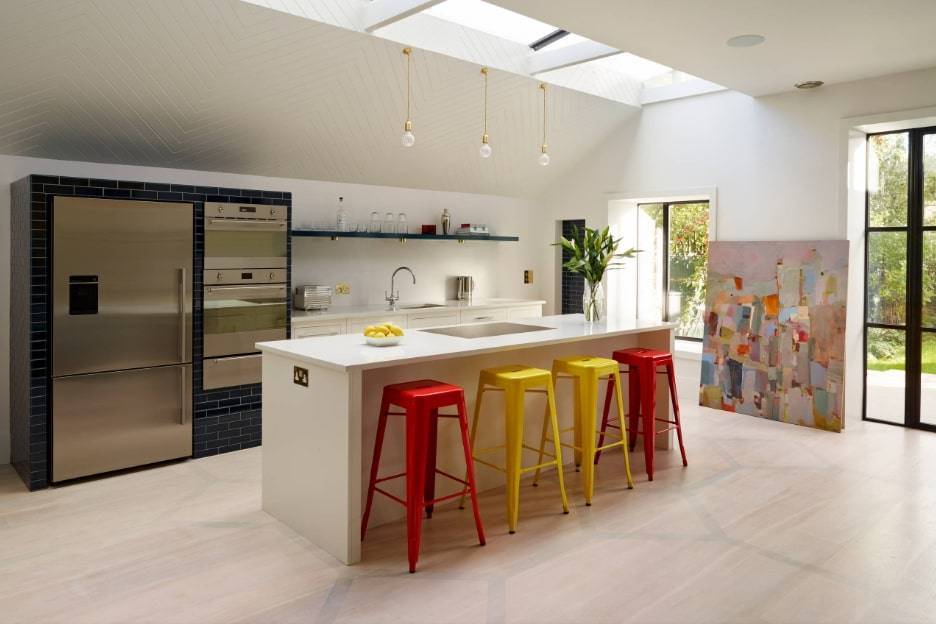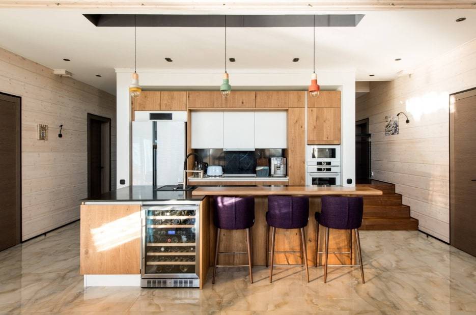 Еще одна идея для размещения кухни с баром — это расширение кухонного острова, который может находиться в центре всей комнаты, соединяющей кухню с гостиной. Мини-бар с необычными высокими стульями — это красивое дополнение и функциональное использование пространства. Если на кухне курите, разговаривая с одним из членов семьи или гостями в зале, то барная стойка — подходящее место для проведения комфортного диалога.