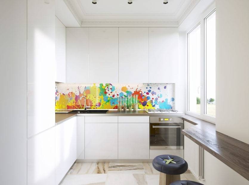 В маленьком помещении часто не хватает места даже для барной стойки. Поэтому ее часто совмещают с подоконником. Это прекрасный вариант, особенно если из окна открывается красивый вид. Что же касается реализации данного варианта, то чаще всего стойку устанавливают отдельно от рабочей зоны. Или же это может быть продолжение угловой кухни с заходом под окно. Каждый вариант имеет свои преимущества. Однако возможны и некоторые неудобства в данном решении. Это радиатор, в который будут упираться ноги, а также холод от окна. В большинстве случаев с поверхности необходимо убирать все предметы, чтобы полностью открыть окно.