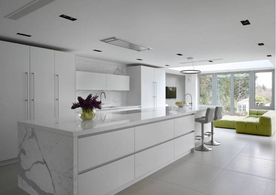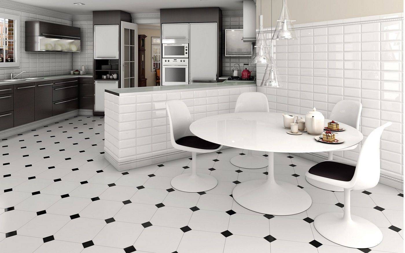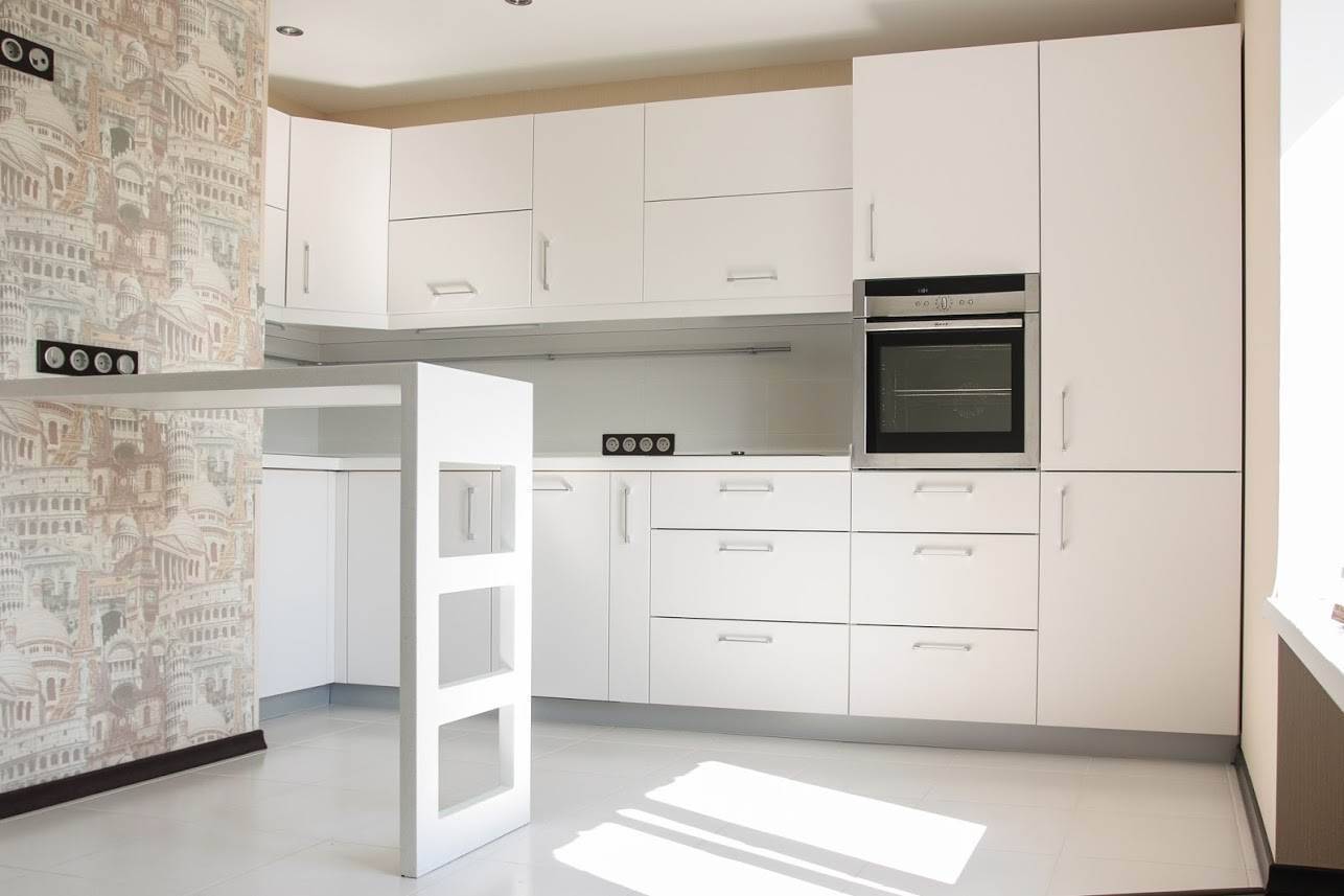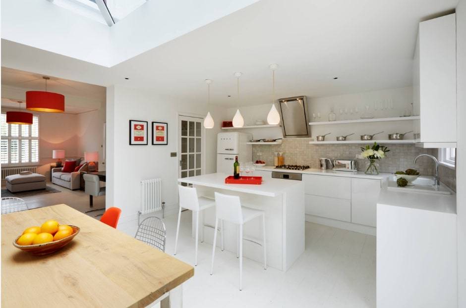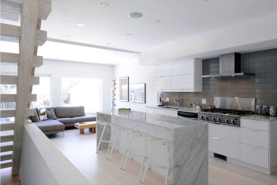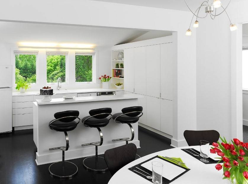 Белый цвет эффектно гармонирует со всевозможными оттенками, позволяя вдоволь экспериментировать. Столешницы кухонного гарнитура, обеденного стола и барной стойки изготовьте из искусственного камня цвета «графит», а на пол положите плитку из керамогранита аналогичного оттенка.