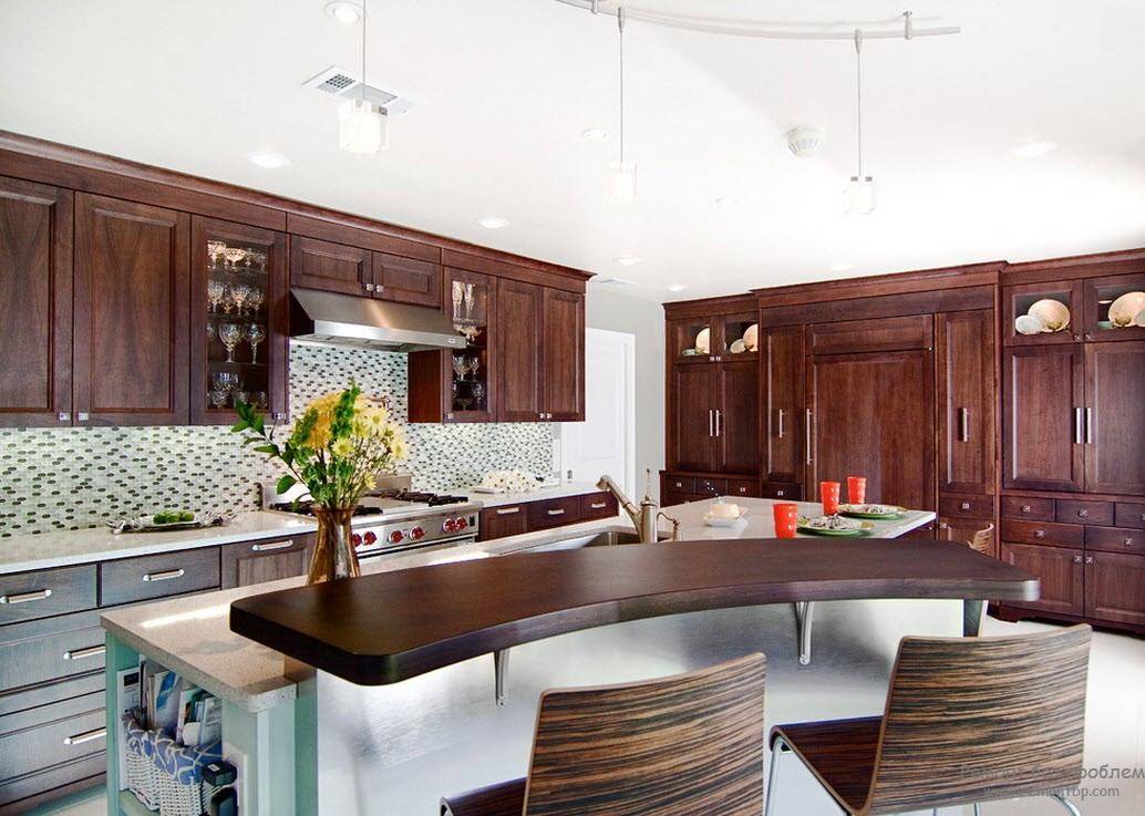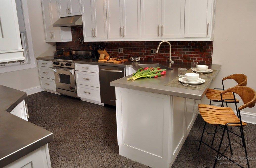 В отличие от предыдущего варианта, данный вид состоит из двух частей. Одна из них используется, как барная стойка, а другая, как рабочая поверхность. Такое решение определенно подходит для просторной кухни и обеспечивает оптимальное использование пространства.