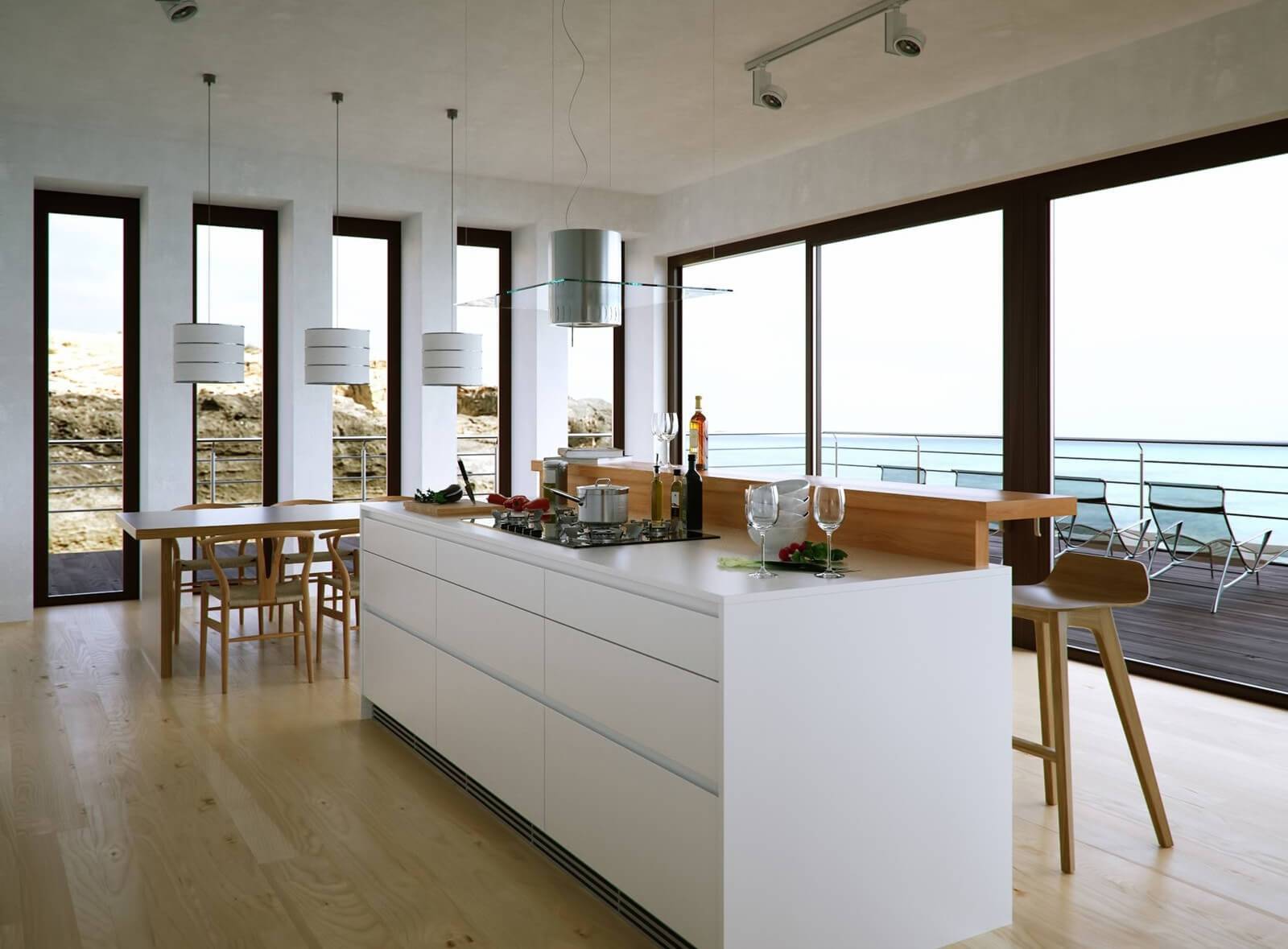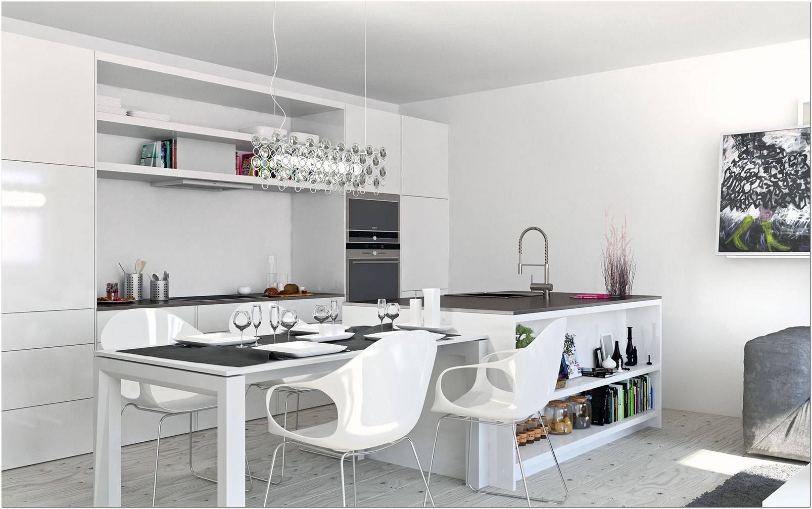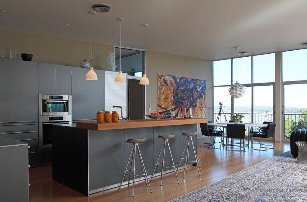 Если вы откажетесь от обычного обеденного стола, заменив его широкой барной стойкой, то сможете не только эффектно подчеркнуть заданный современный стиль, но и сделаете пространство более эргономичным и удобным.