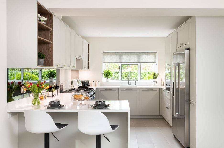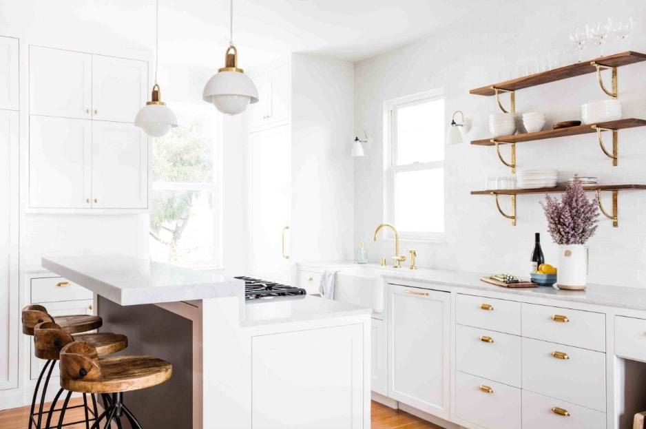 - откажитесь от верхних шкафчиков в пользу открытых полок, расставив на них чашки, бокалы, элементы декора;