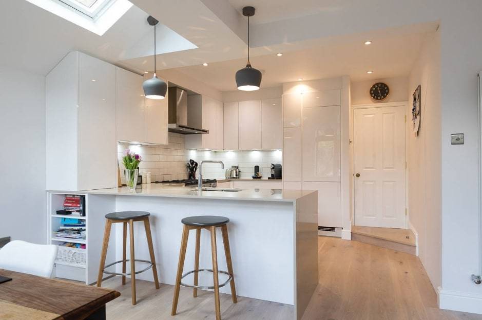 В небольших апартаментах не всегда есть место для столовой. Однако, еда на низком столике в гостиной — не очень хорошая идея. Если вы хотите отделить кухню от гостиной и в то же время получить в этой ситуации комфортное место для еды, это лучшее решение — барная стойка. Несмотря на то, что кухня узкая, вы всегда сможете скрыть барные стулья под столешницей и, следовательно, они не будут занимать ценное пространство. Обычно на таких уютных конструкциях помещаются два человека, что очень удобно для малой семьи. Если вы хотите разместить больше гостей, тогда барная стойка должна быть расширена, чтобы у каждого было немного места для себя.