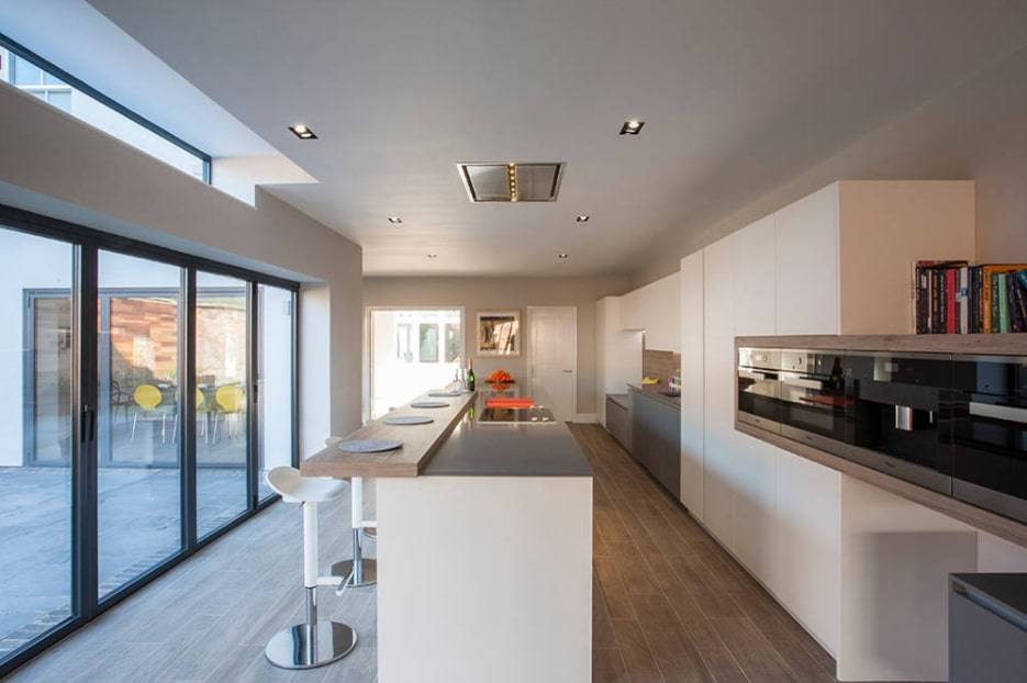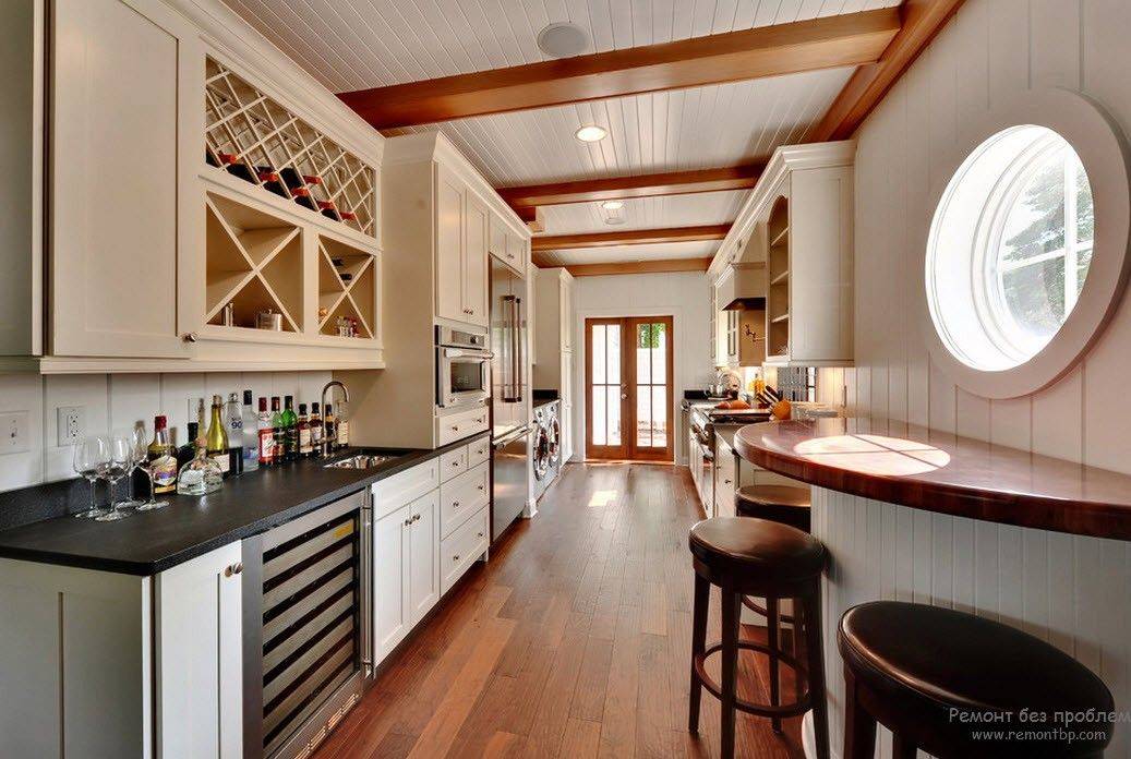 В данном случае предполагается, что мебель и кухонная техника расположены у противоположных двух стен. Это значительно экономит пространство, особенно, если помещение узкое. Однако, следует помнить о том, что свободное место между стенами должно составлять как минимум полтора метра. Таким образом, кухня получается в два ряда: с одной стороны барная стойка, а с другой – рабочая поверхность. Для подобного варианта идеальна закрытая модель, снабженная множеством стеллажей, полок и шкафчиков. Поскольку конструкция в данном случае является неотъемлемой частью в функциональном и стилистическом плане, она должна быть выполнена в одной цветовой гамме с остальной кухонной мебелью.