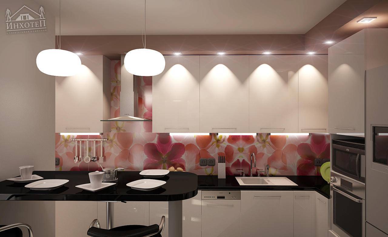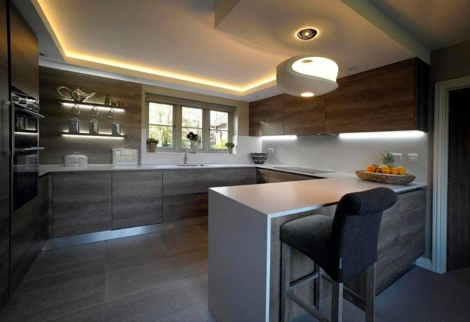 Выделить зону кухни можно при помощи потолочного короба, расположенного по периметру и оснащенного точечными светильниками.