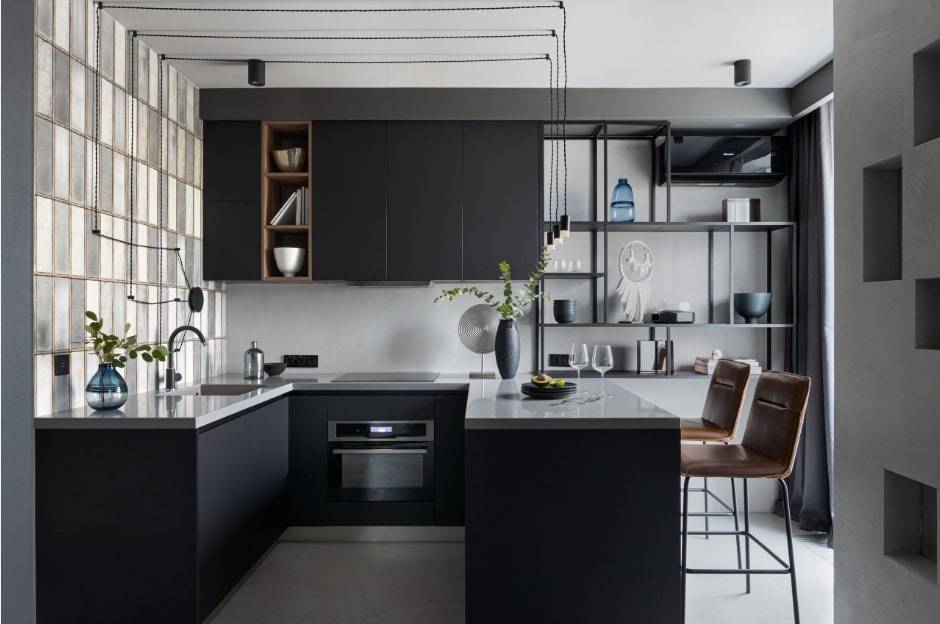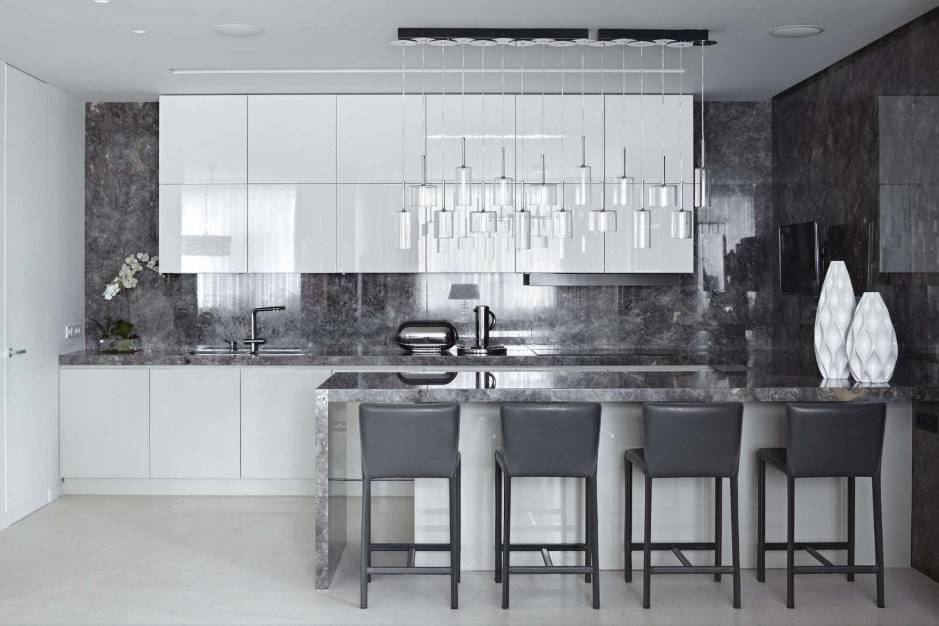 Дополнят уникальность интерьера простые белые фасады, контрастирующие с черной столешницей рабочей зоны и барной стойки, а также высокие барные стулья.