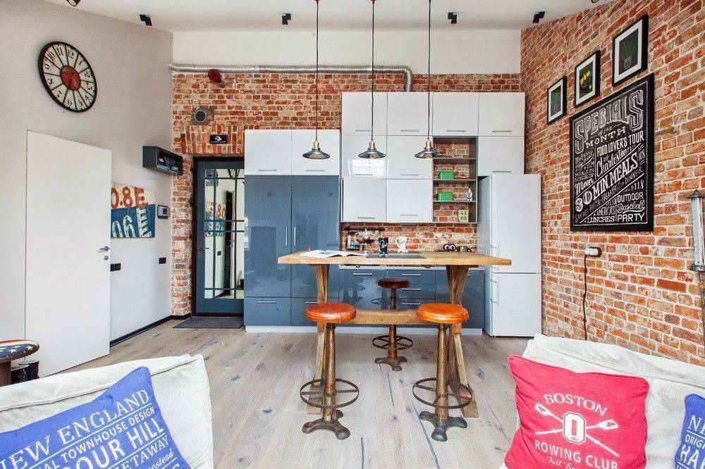 Этот стиль подходит обладателям квартир с высокими потолками. Его отличительными особенностями являются открытая планировка и совмещение разных архитектурных решений. Потолки и стены в таком помещении имеют грубую отделку. Конечно же, в огромном пространстве необходимо использовать зонирование. Вот с этой функцией в кухне-гостиной и справится барная стойка.