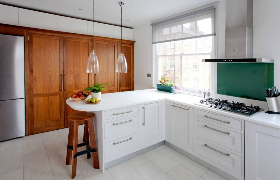 Главным отличием П-образной кухни является то, что вся мебель и техника размещены вдоль стен, а точнее, трех стен. Это позволяет довольно свободно передвигаться в помещении, если грамотно разместить все элементы интерьера. В данном случае идеальным решением послужит пристенная барная стойка, представляющая конструкцию с удлиненной столешницей, зафиксированную на стене или же вплотную к ней расположенную. Такая модель стойки не перегружает пространство, оставляя много свободного места. Стойка в П-образной кухне – это гармоничное продолжение рабочей поверхности.