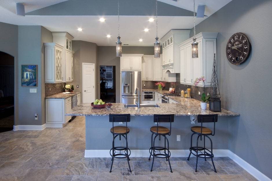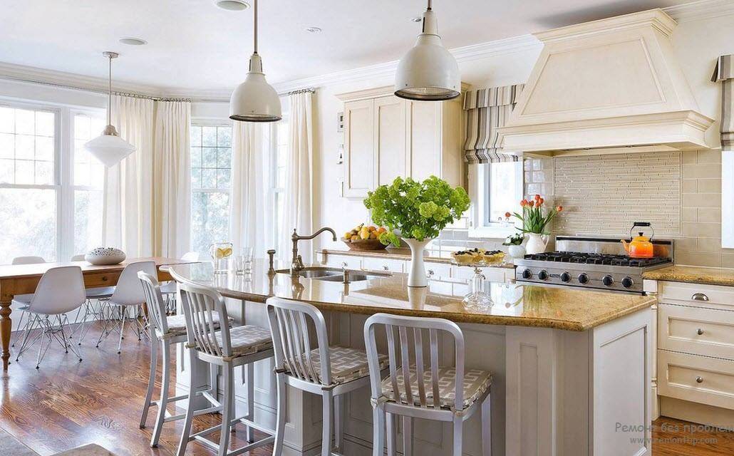 Он отличается лаконичностью, легкостью, теплотой и уютом. Для дизайна помещения в средиземноморском стиле характерны натуральные материалы, светлые краски с небольшим количеством ярких оттенков. Здесь будет уместной прямоугольная барная стойка, которая может стать дополнительной рабочей поверхностью, где будут размещены ваза для фруктов, хлебница или чайник.