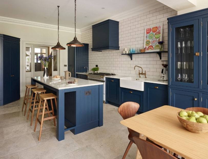 Все это эффектно будет дополнено металлическим блеском смесителей, бытовой техники, ручек. Изысканность средиземноморского стиля подчеркнет рабочий фартук, созданный из небольших плиток серо-голубого цвета.