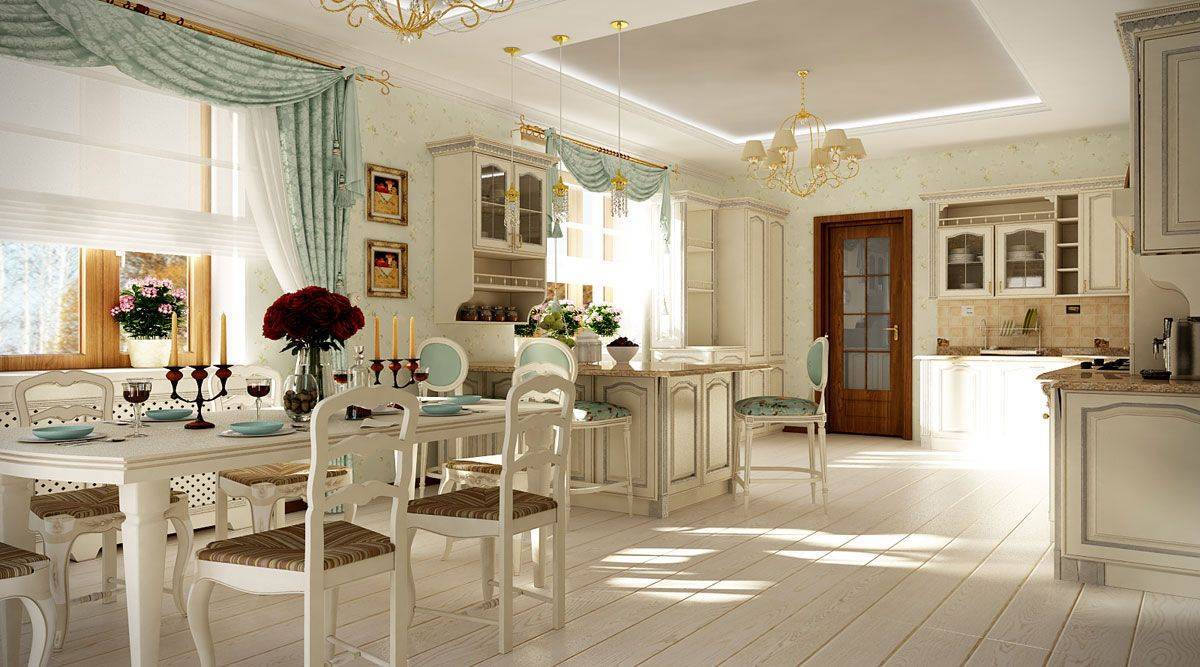 Чтобы воссоздать нечто подобное и у себя дома, первое, на что необходимо обратить внимание, так это на правильное выделение функциональных зон. Кухня и зал отделяется барной стойкой, тон, форма и стиль которой идентичен тому, который присутствует в очертаниях мебельного гарнитура