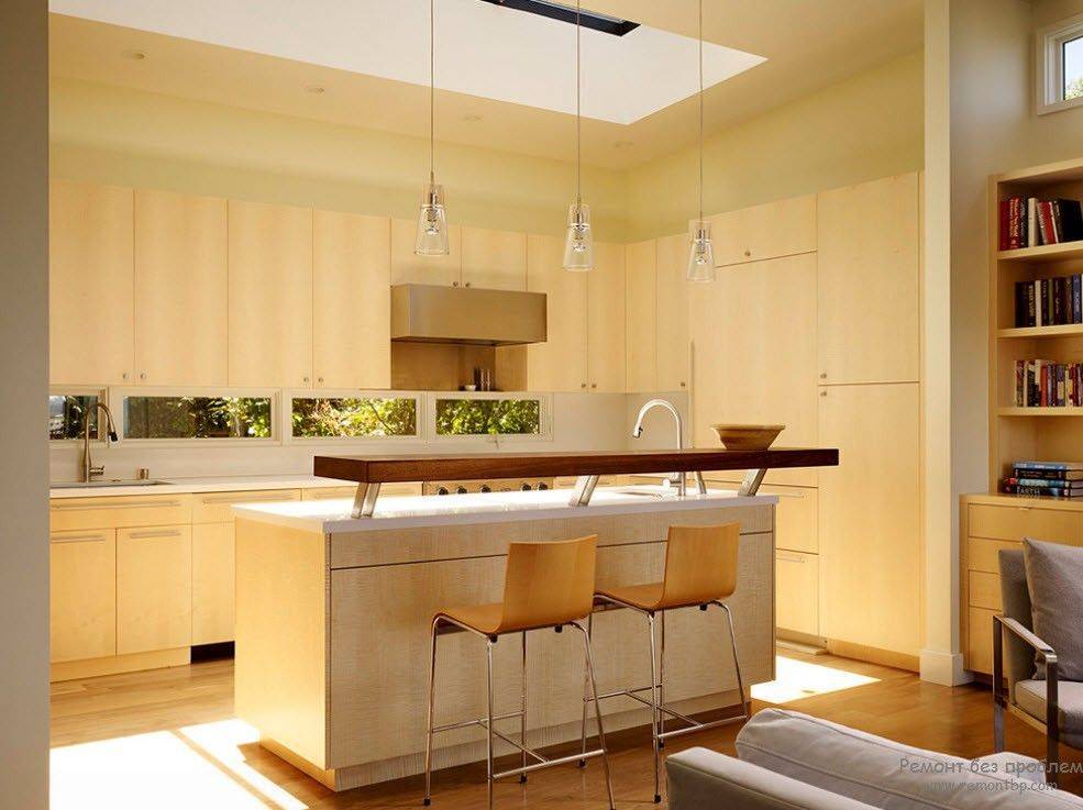 - свисающие низко потолочные люстры над обеденным столом и барной стойкой;