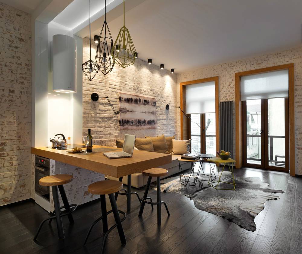 В квартирах-студиях барная стойка часто является необходимым предметом, без которого сложно представить грамотное зонирование пространства. Кроме того, она нередко украшает интерьер. Особенно в случае, если используются контрастные, сложные конструкции с различным декором, необычным освещением или другими деталями. Поскольку в студиях открытая планировка, барная стойка может использоваться, как перегородка. Поэтому она часто оформлена с помощью декоративной кирпичной кладки или камня. Конечно же, только в том случае, если это уместно в выбранном стиле интерьера.