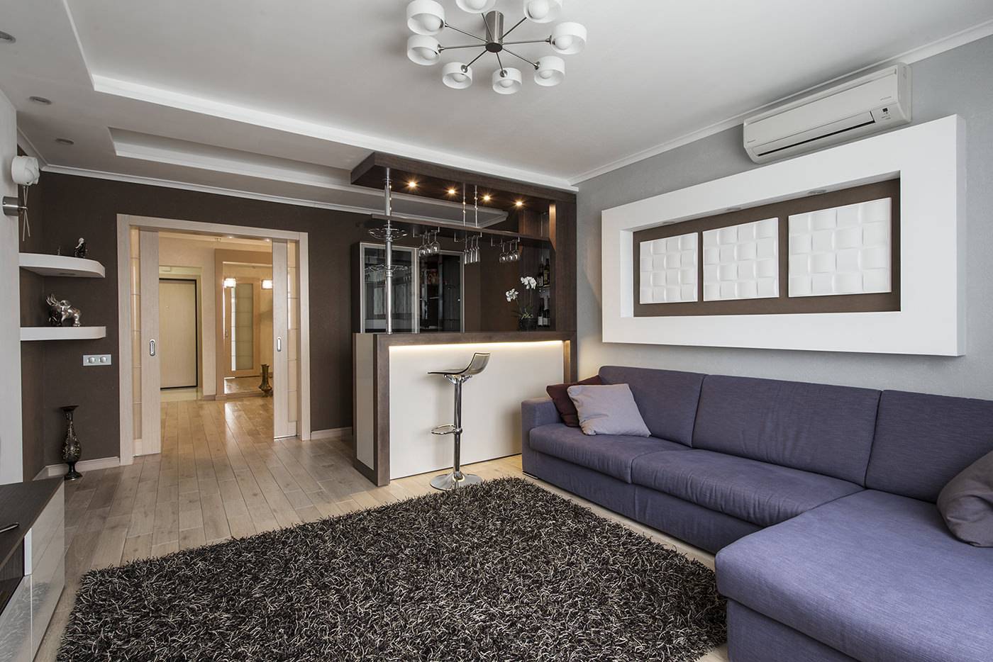 Данный стиль будет находкой для малогабаритных квартир. Барная стойка здесь служит разделителем между гостиной и кухней. Ее стиль, форма и цветовая гамма должна повторять очертания мебельного гарнитура. В таком помещении стойка может успешно заменить обеденный стол, что сделает его удобным и эргономичным. Рядом будут отлично смотреться высокие стулья.