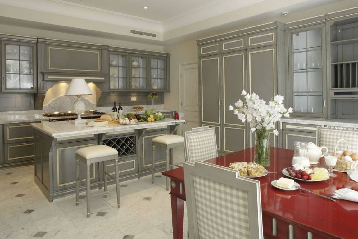 Наиболее часто интерьер кухни студии делают в классическом стиле. Особенно хорошо он смотрится в частном доме, где достаточно места для массивной деревянной мебели.