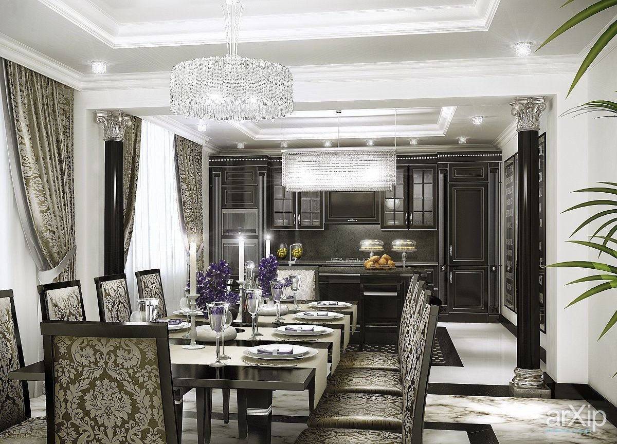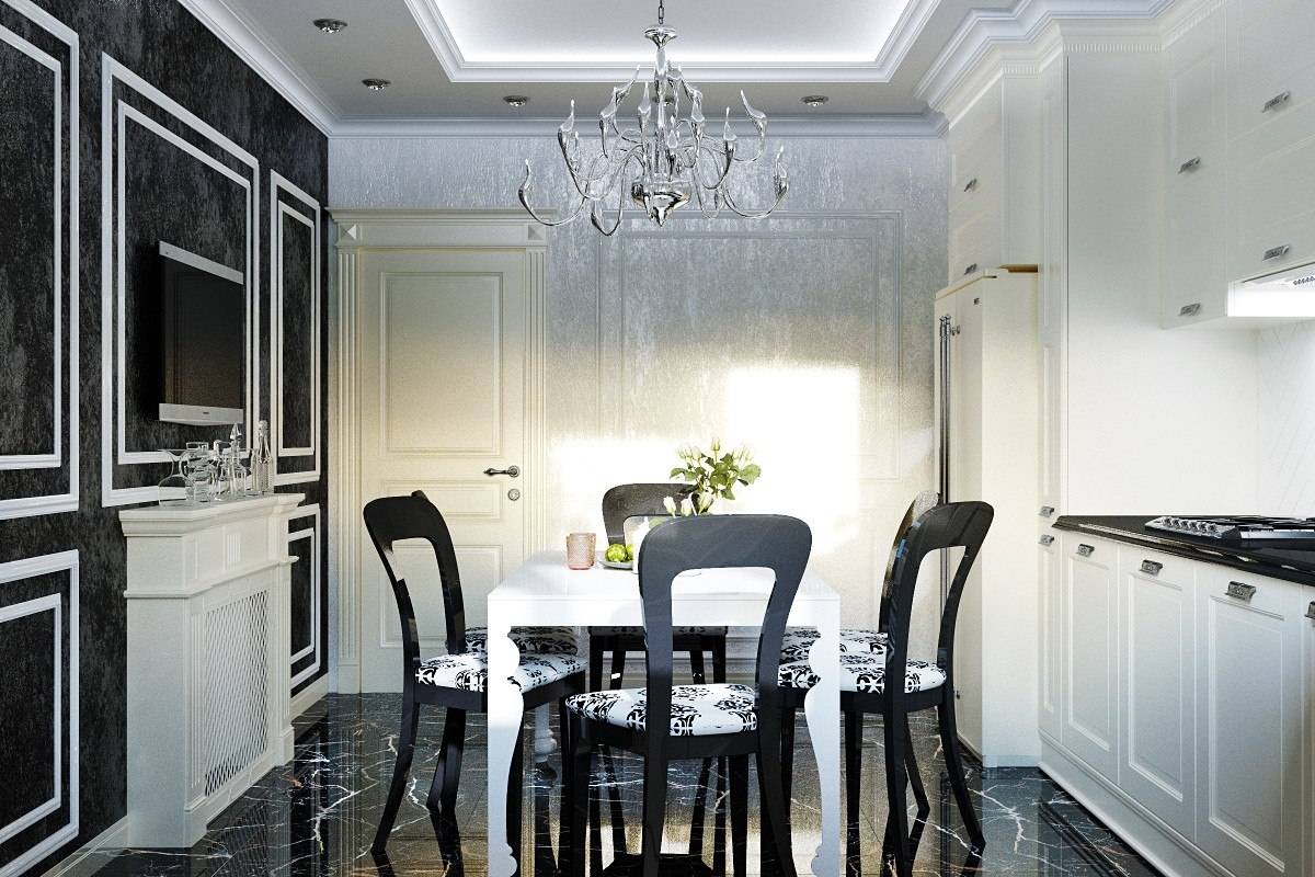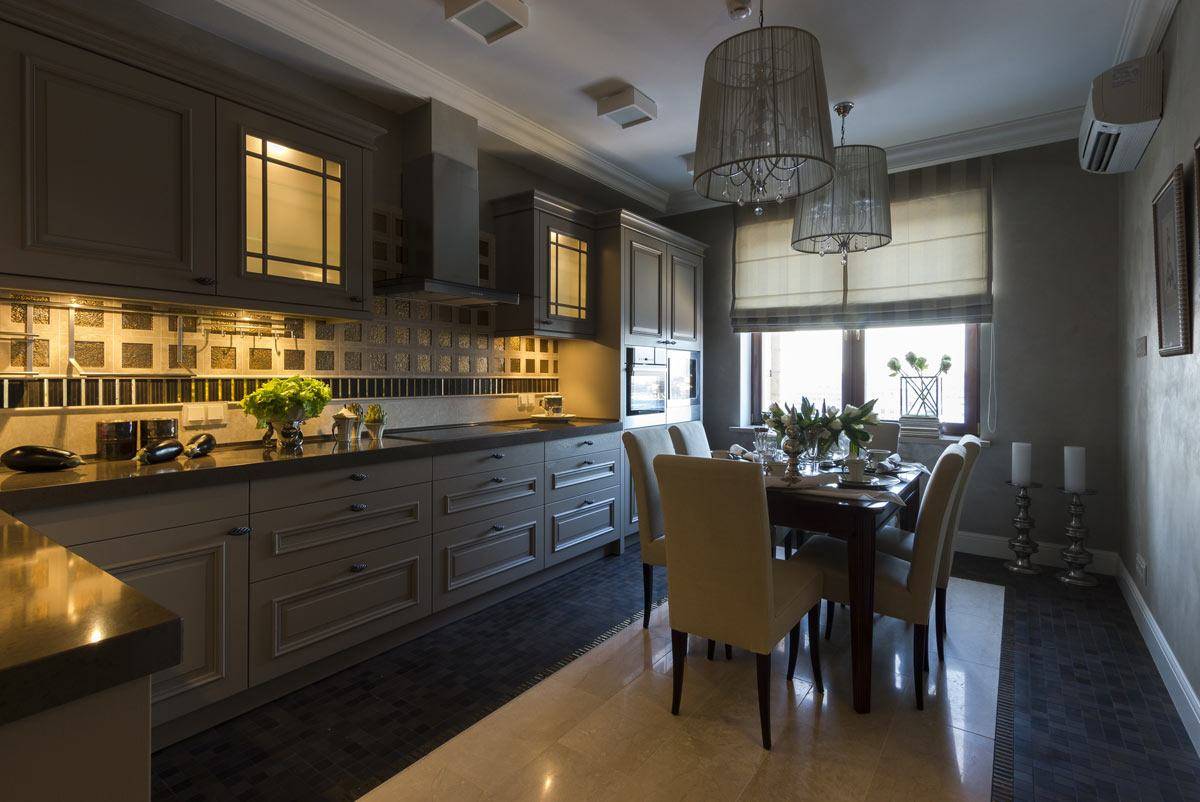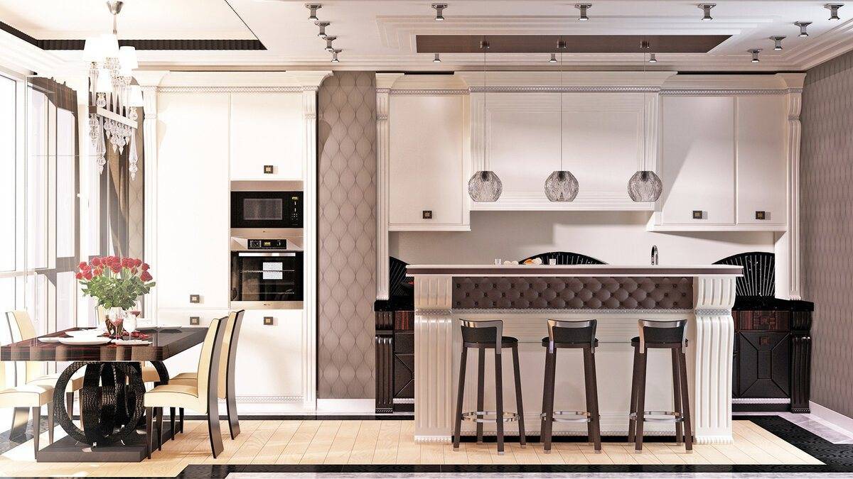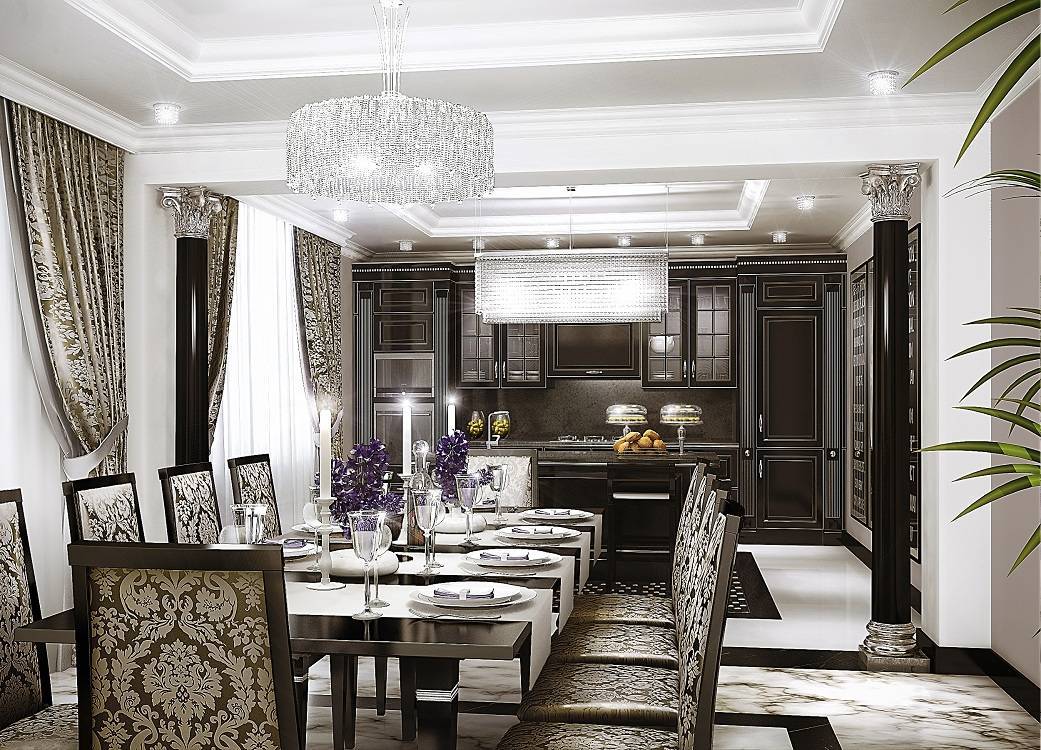 Еще более впечатляющей является кухня в стиле арт-деко в сочетании со столовой. В такое пространство вы можете ввести больше элементов, которые относятся к этому направлению. Декоративная мебель для столовой, такая как стол с причудливо вырезанными ножками и стулья с оригинальной спинкой, прекрасно сочетаются с кухонной гарнитуром. Не забывайте про экстравагантный пол из натурального камня.