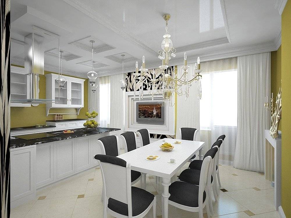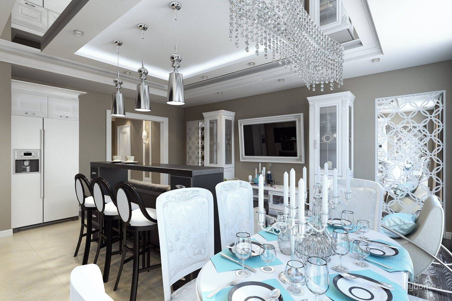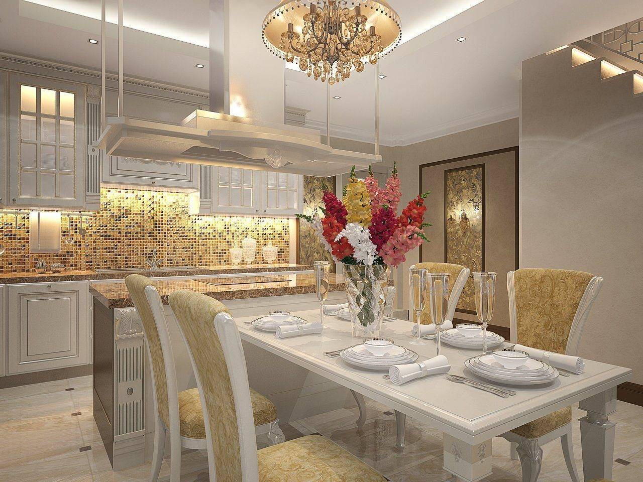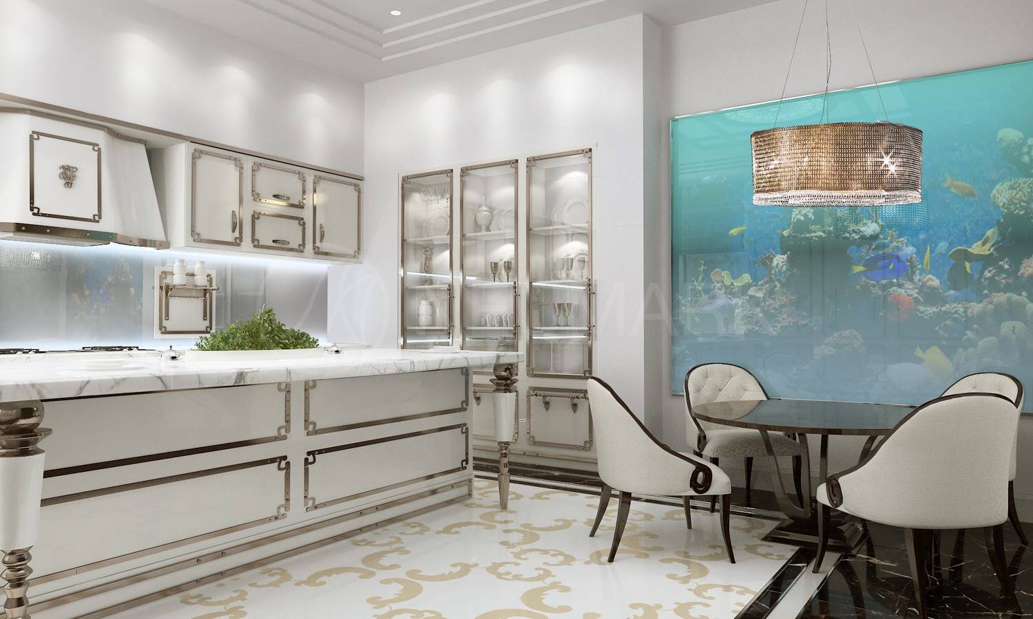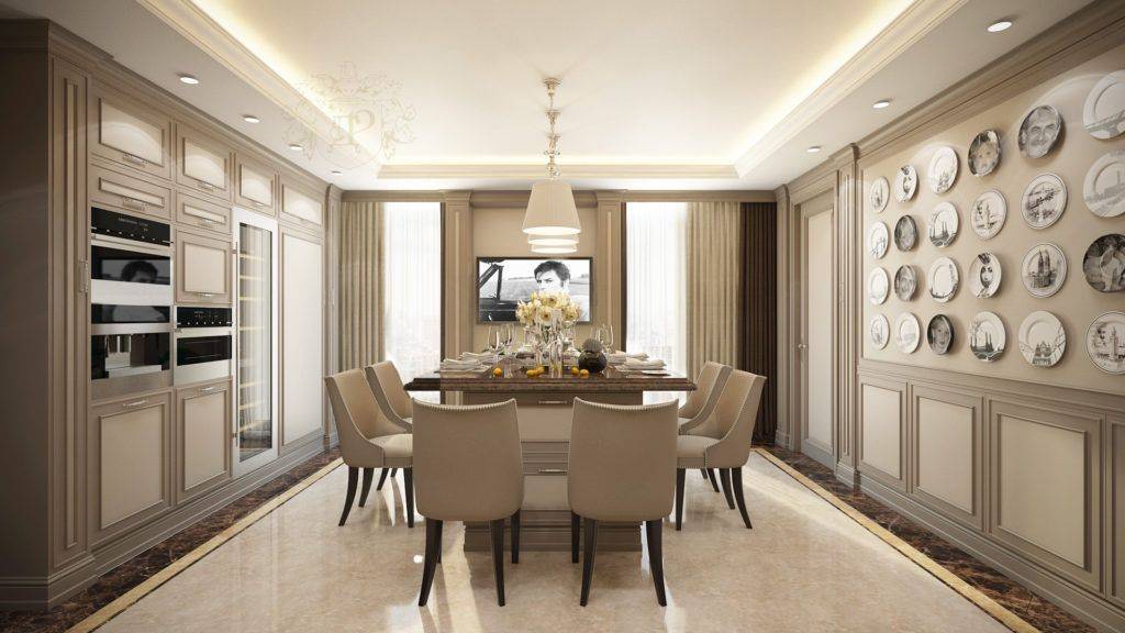 Еще более впечатляющей является кухня в стиле арт-деко в сочетании со столовой. В такое пространство вы можете ввести больше элементов, которые относятся к этому направлению. Декоративная мебель для столовой, такая как стол с причудливо вырезанными ножками и стулья с оригинальной спинкой, прекрасно сочетаются с кухонной гарнитуром. Не забывайте про экстравагантный пол из натурального камня.