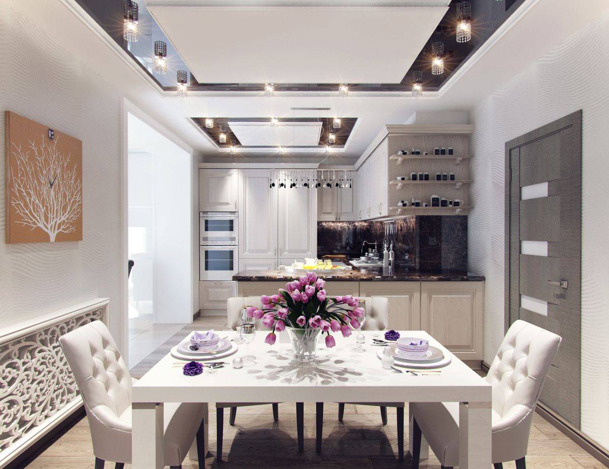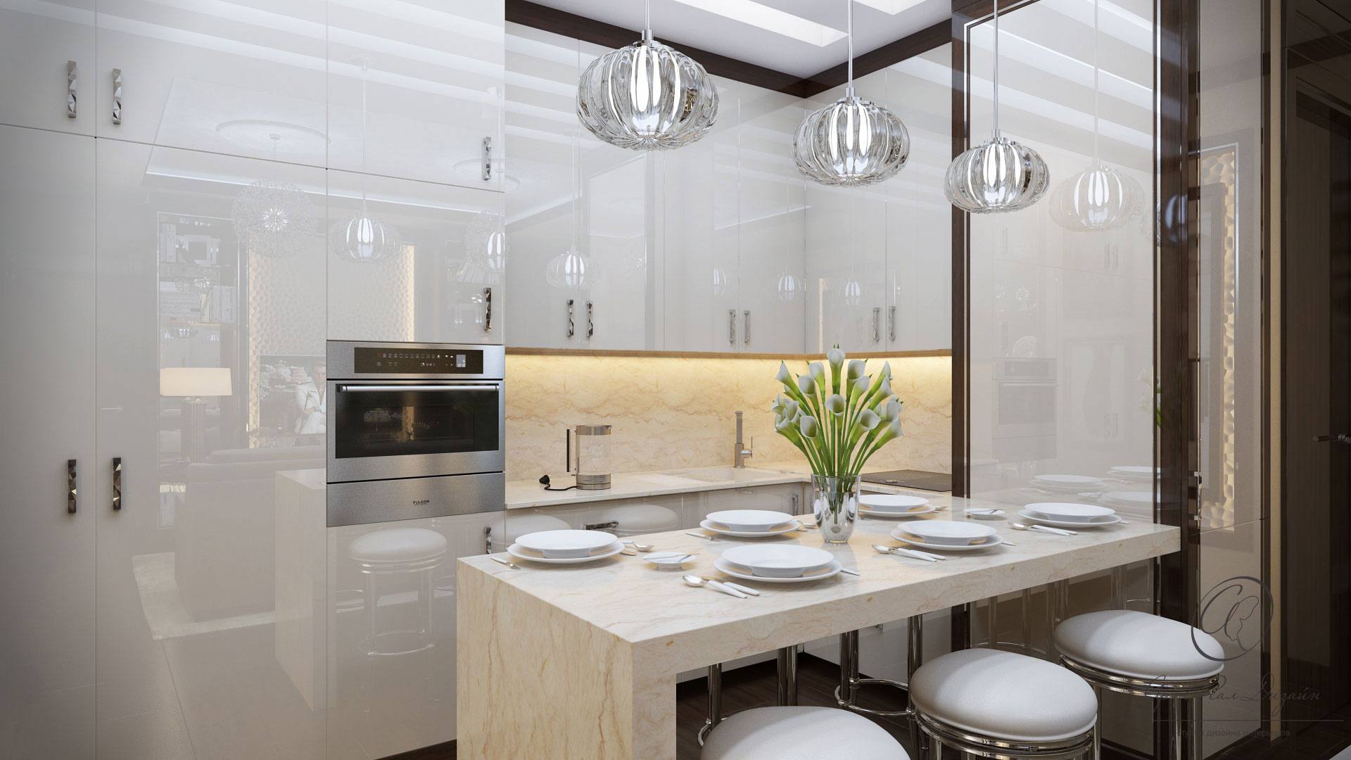 Дизайн линейной кухни с обеденной зоной в стиле арт-деко.