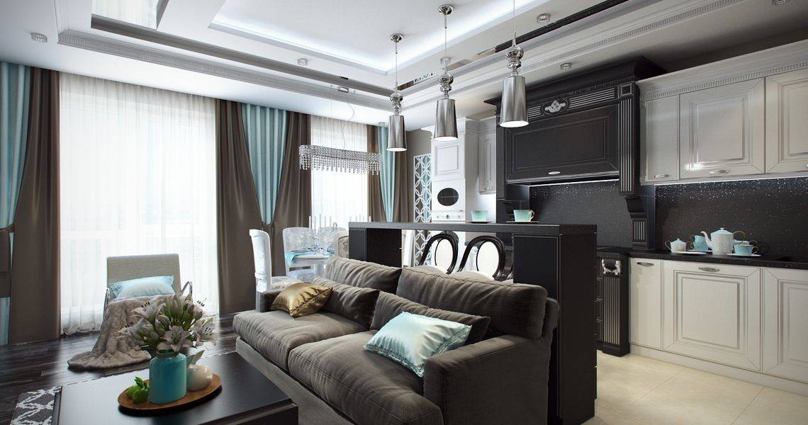 Для полноценного интерьера важно чёткое зонирование, ступенчатые элементы дизайна, использование блестящих и глянцевых поверхностей, предметы искусства в качестве декора