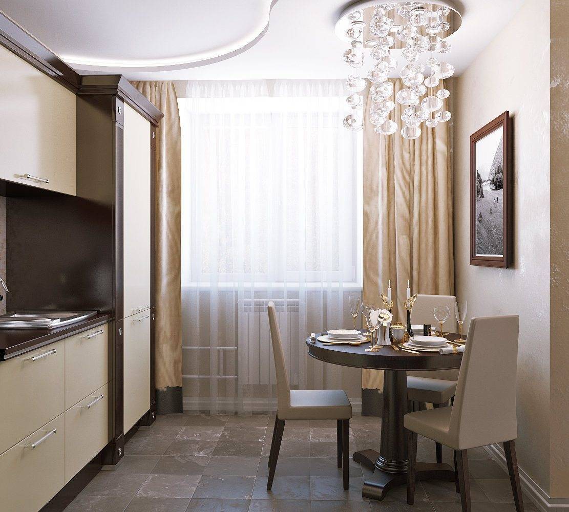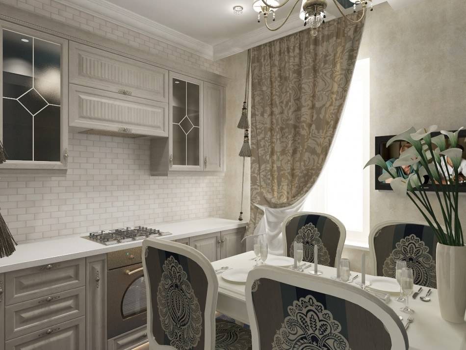 На фото кухня с комбинированными гардинами в пол, орнамент которых перекликается с обивкой стульев.