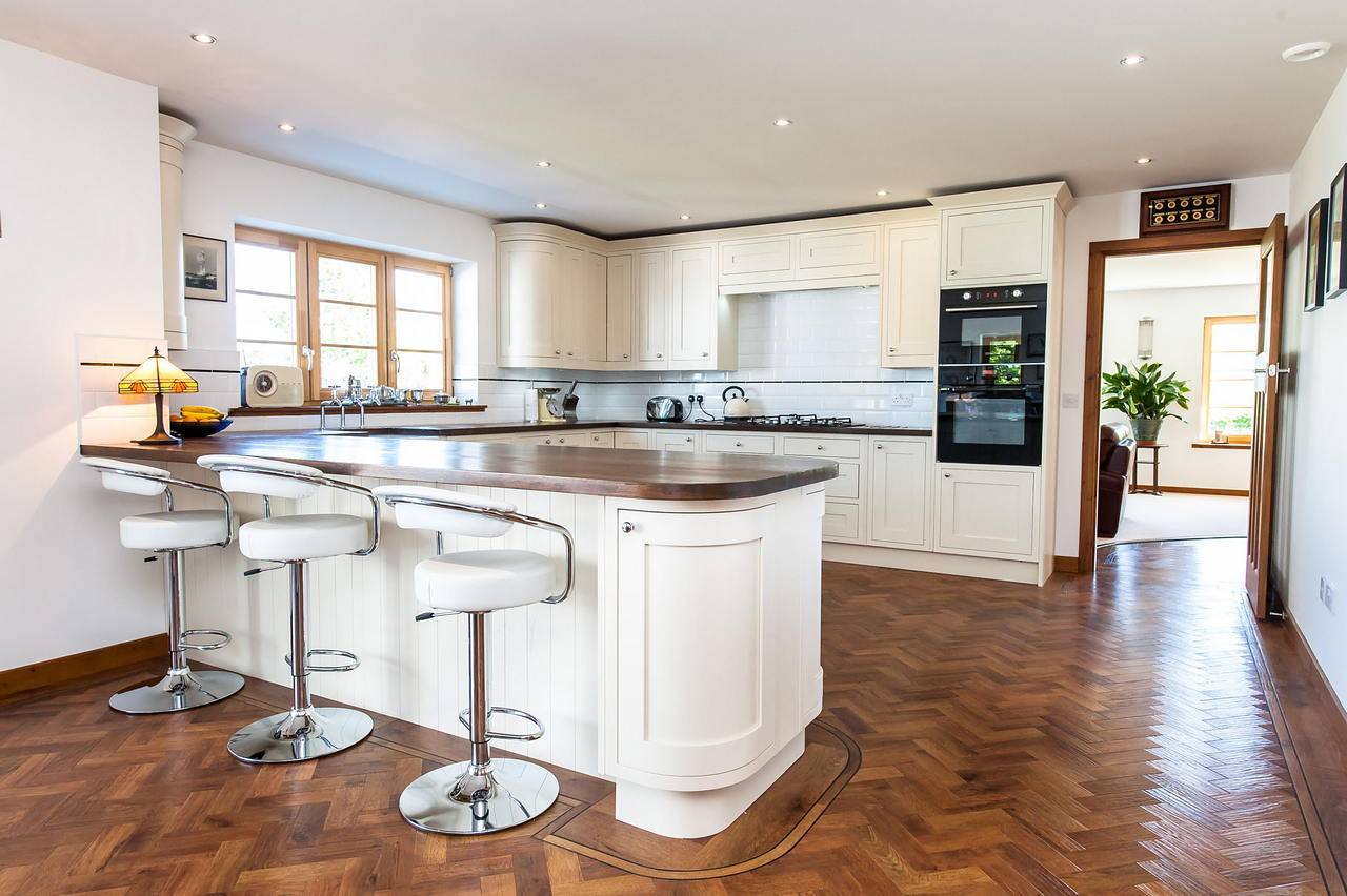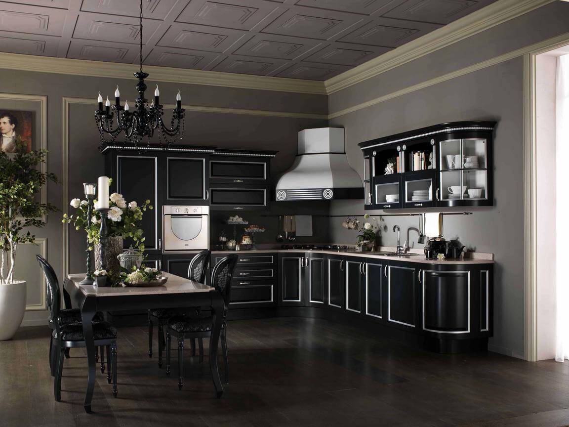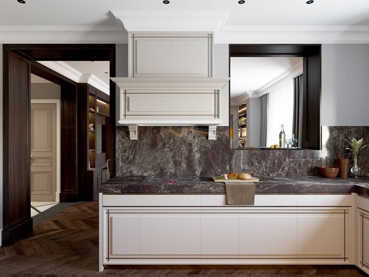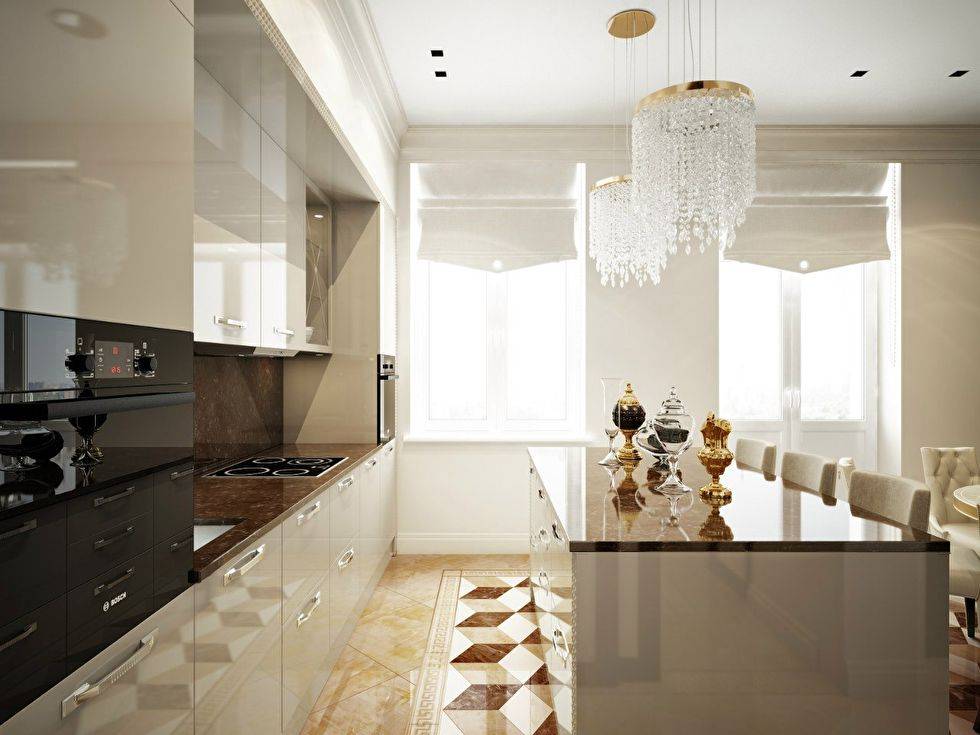 За гарнитуром должна находиться современная техника, хорошо подойдет стеклянная вытяжка. Посуда — дорогое стекло и хрусталь.