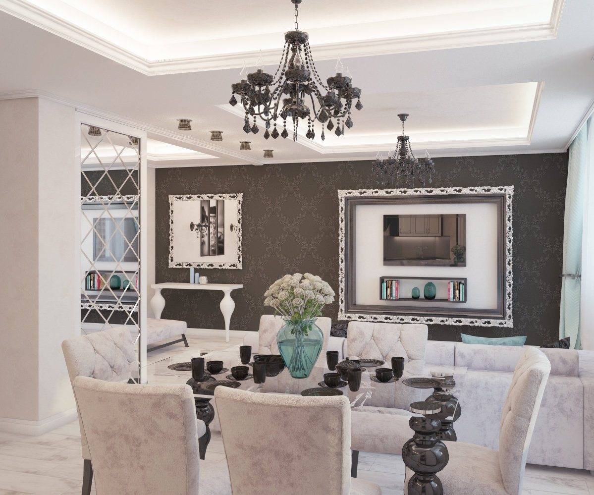 Многоярусный потолок с точечным освещением дополняет общую композицию стиля арт деко, в котором выполнена гостиная