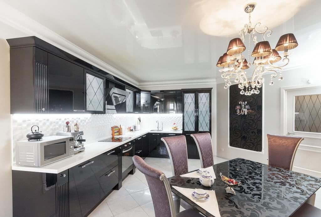 Меблировка кухни подбирается качественная, дорогостоящая, преимущественно глянцевая. Популярные расцветки – белоснежная, черная, каштановая, оливковая, темно-синяя, бежевая. Если гарнитур подбирается двухцветным, то верхние шкафчики делаются светлыми – тогда изделие визуально кажется более устойчивым.