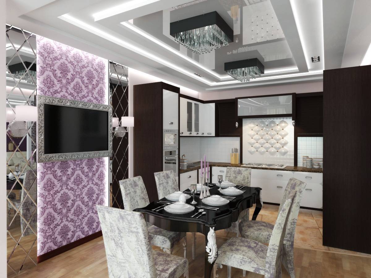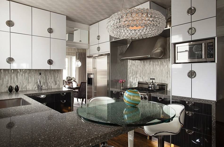Зеркальное покрытие применяется к шкафчикам, их дверцам. Посуда, сервизы и другие атрибуты приготовления пищи хранятся в шкафах. Стиль призван показать кухню уютным местом отдыха.