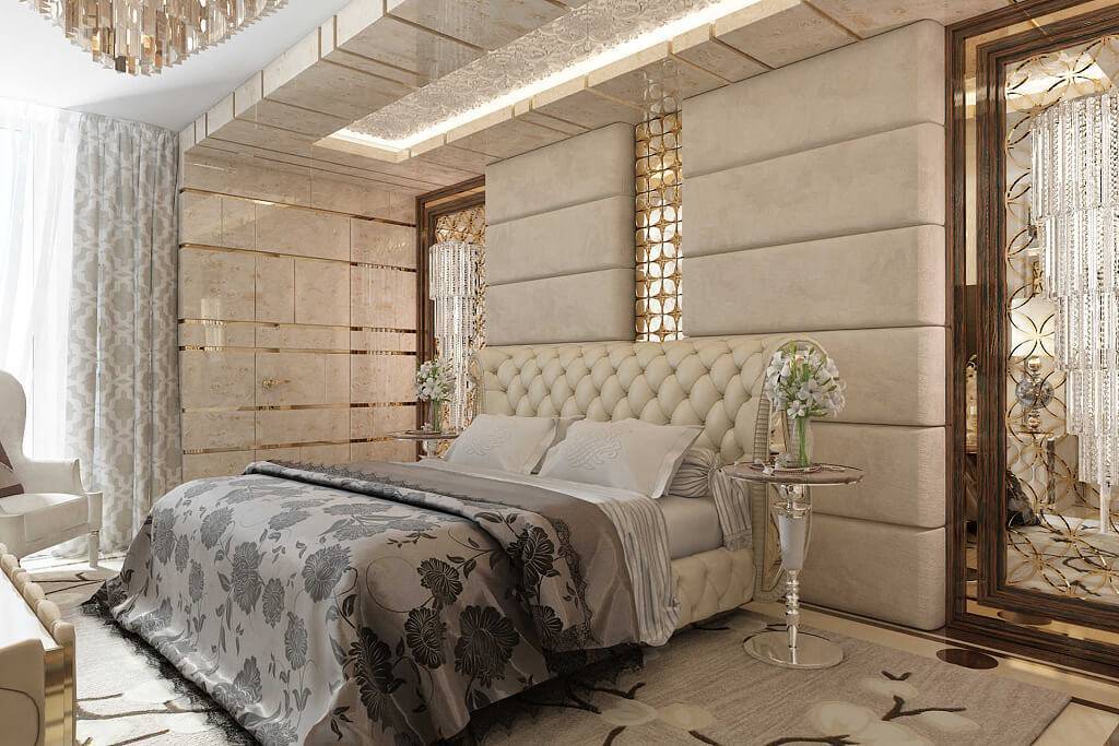 Спальня в светло-бежевых тонах с широкой кроватью отлично подойдет для отдыха и сна. Дизайнерский проект составлен грамотно. В соответствии со стилем арт-деко подобрано эксклюзивное освещение.
