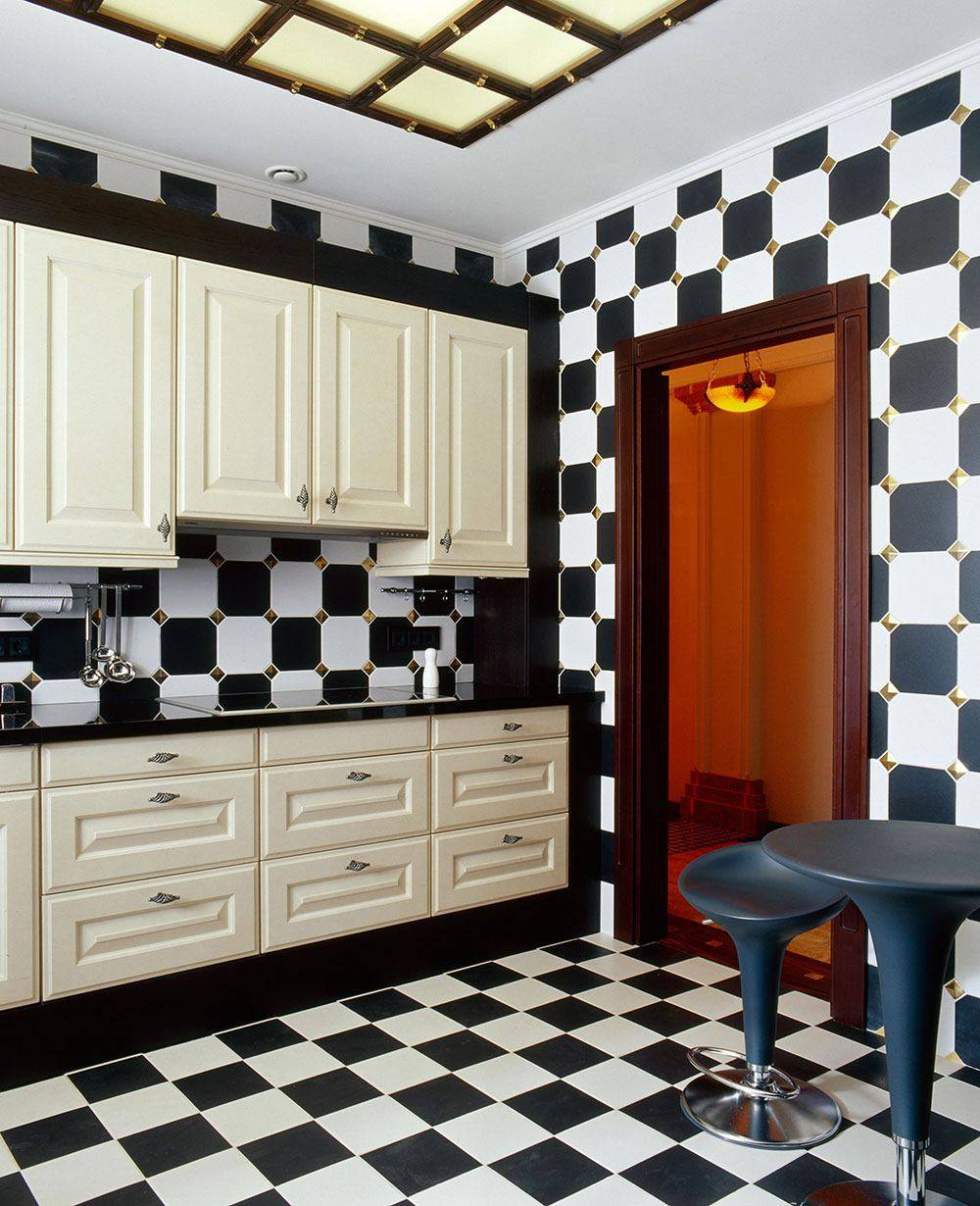 Идеально подойдут наливные полы на кухне или блестящий паркет. В определенных случаях применяется линолеум. Требование стиля — мозаичный рисунок или варианты с клеткой, елочкой и зеброй.