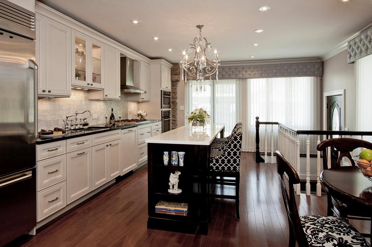Хорошее освещение: люстра и точечная подсветка рабочей зоны, обязательно для стиля