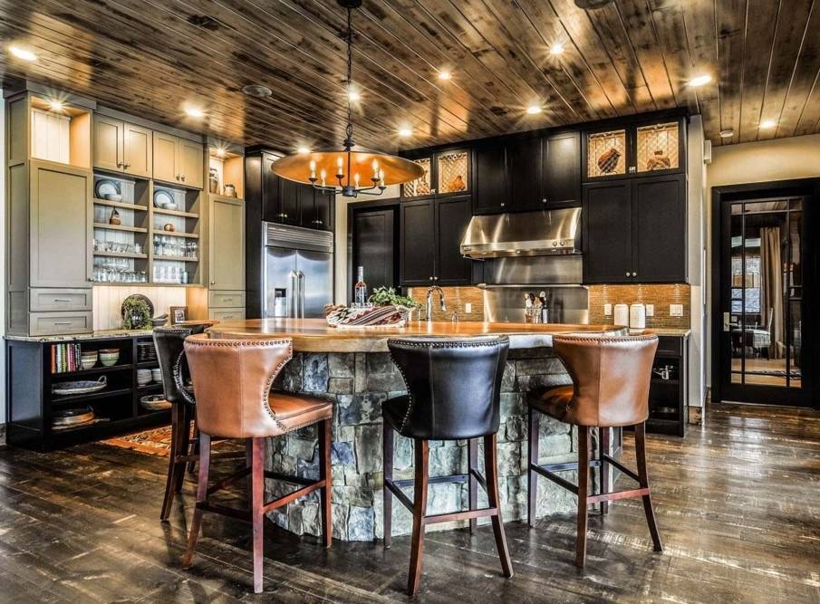 В доме лучшим решением будет отсутствие потолка, позволяющее увидеть деревянные фермы и перекрытия крыши. Такой вариант возможен только при строительстве дома, в квартире же достаточно покрасить оштукатуренный потолок.