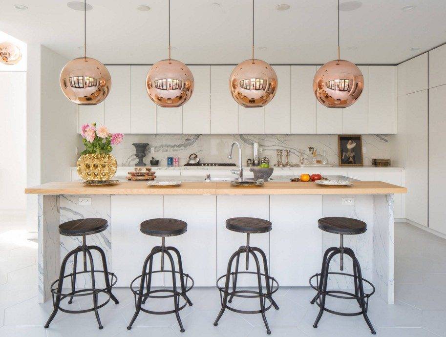 Не стесняйтесь разместить помимо большой люстры еще несколько светильников. Часто используются винтажные эмалированные плафоны для одноламповых висящих светильников.