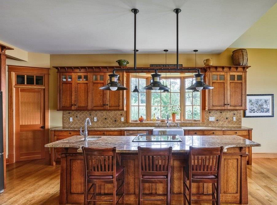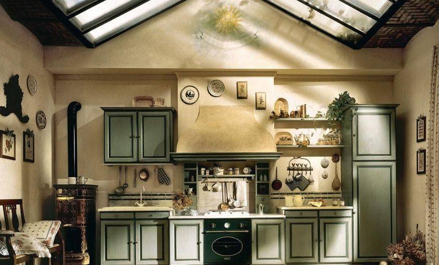 Многие модели украшают вставками из фарфора, абажурами из стекла или ткани. Помните, что на такой кухне должно быть много света: естественного и искусственного.